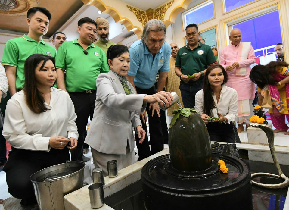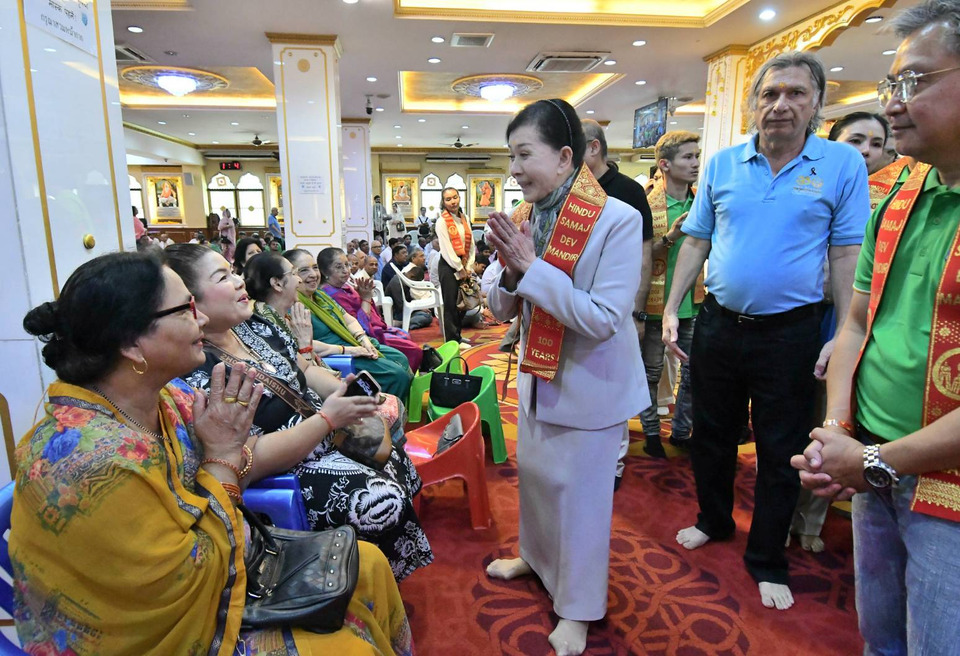 โดยจุดแรก นางปวีณาและคณะเดินทางไปยังวัดเทพมณเฑียร หรือสมาคมฮินดูสมาช ถนนศิริพงษ์ แขวงสำราญราษฎร์ เขตพระนคร กรุงเทพฯ โดยได้เข้ากราบสักการะองค์เทพศักดิ์สิทธิ์ภายในศาสนสถาน ซึ่งได้รับการต้อนรับอย่างอบอุ่นจากคณะกรรมการวัดและพี่น้องประชาชนที่มาทำบุญ ในโอกาสนี้ได้มีการแลกเปลี่ยนความคิดเห็นเกี่ยวกับบทบาทของชุมชนชาวไทยเชื้อสายอินเดียในการขับเคลื่อนเศรษฐกิจย่านเมืองเก่า และแนวทางการส่งเสริมสวัสดิการสังคมให้เข้าถึงคนทุกกลุ่ม