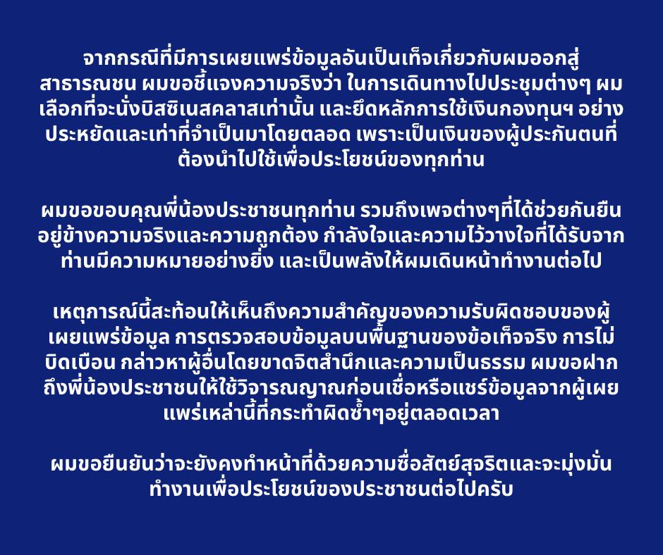 จากกรณีที่มีการเผยแพร่ข้อมูลอันเป็นเท็จเกี่ยวกับผมออกสู่สาธารณชน ผมขอชี้แจงความจริงว่า ในการเดินทางไปประชุมต่างๆ ผมเลือกที่จะนั่งบิสซิเนสคลาสเท่านั้น และยึดหลักการใช้เงินกองทุนฯ อย่างประหยัดและเท่าที่จำเป็นมาโดยตลอด เพราะเป็นเงินของผู้ประกันตนที่ต้องนำไปใช้เพื่อประโยชน์ของทุกท่าน