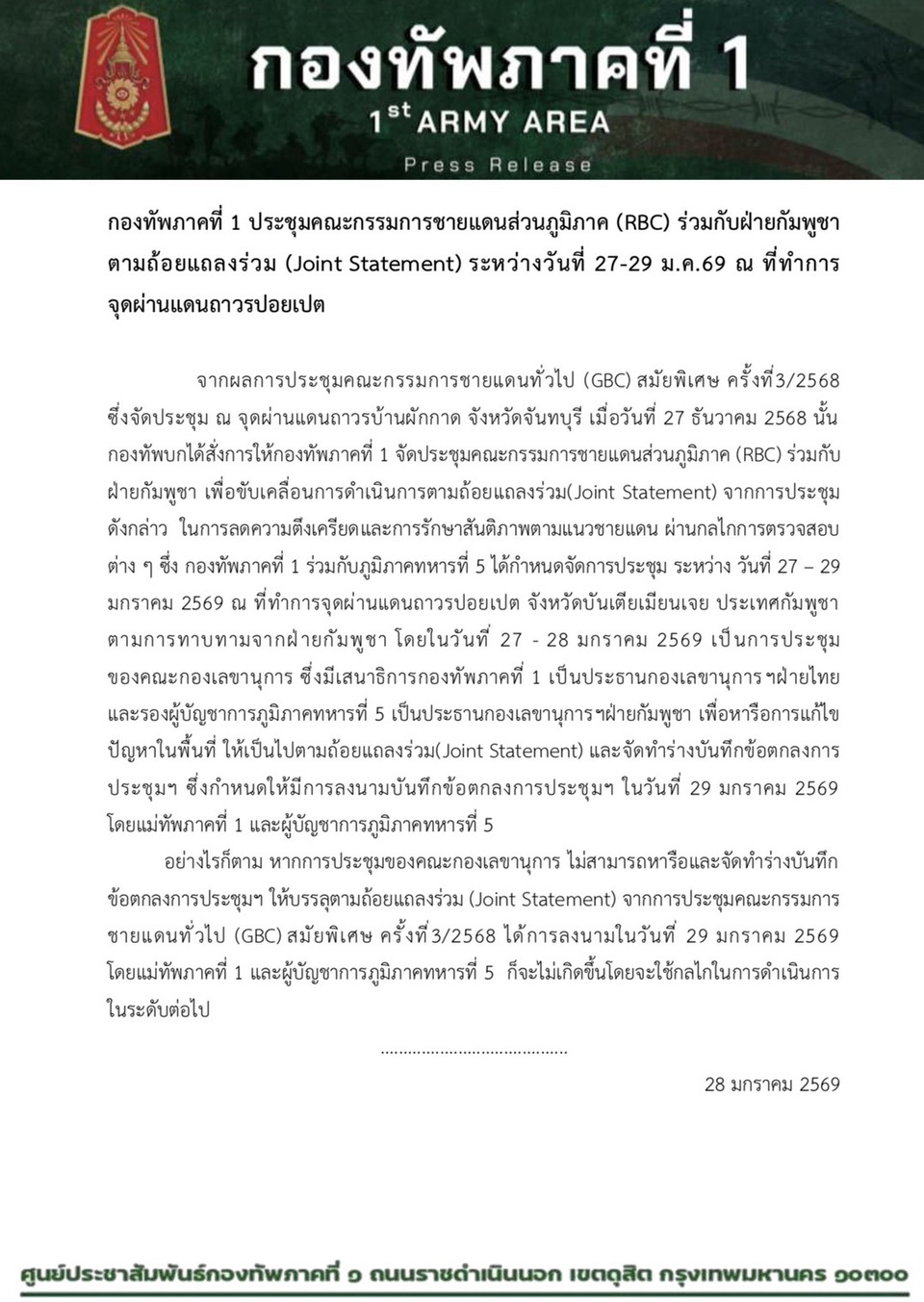 จากผลการประชุมคณะกรรมการชายแดนทั่วไป (GBC) สมัยพิเศษ ครั้งที่3/2568 ซึ่งจัดประชุม ณ จุดผ่านแดนถาวรบ้านผักกาด จังหวัดจันทบุรี เมื่อวันที่ 27 ธันวาคม 2568 นั้น กองทัพบกได้สั่งการให้กองทัพภาคที่ 1 จัดประชุมคณะกรรมการชายแดนส่วนภูมิภาค (RBC) ร่วมกับฝ่ายกัมพูชา เพื่อขับเคลื่อนการดำเนินการตามถ้อยแถลงร่วม(Joint Statement) จากการประชุมดังกล่าว ในการลดความตึงเครียดและการรักษาสันติภาพตามแนวชายแดน ผ่านกลไกการตรวจสอบต่าง ๆ ซึ่ง กองทัพภาคที่ 1 ร่วมกับภูมิภาคทหารที่ 5 ได้กำหนดจัดการประชุม ระหว่าง วันที่ 27 – 29 มกราคม 2569 ณ ที่ทำการจุดผ่านแดนถาวรปอยเปต จังหวัดบันเตียเมียนเจย ประเทศกัมพูชา ตามการทาบทามจากฝ่ายกัมพูชา โดยในวันที่ 27 - 28 มกราคม 2569 เป็นการประชุม