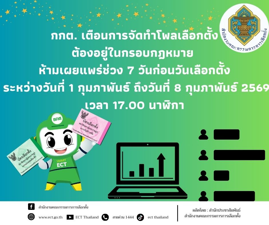 วันที่ 1 ก.พ.69 สำนักงานคณะกรรมการการเลือกตั้ง ขอแจ้งเตือนหน่วยงาน องค์กร สถาบันการศึกษา สื่อมวลชน และผู้ที่เกี่ยวข้องกับการจัดทำหรือเผยแพร่ผลการสำรวจความคิดเห็นของประชาชน หรือโพลเกี่ยวกับการเลือกตั้งสมาชิกสภาผู้แทนราษฎร ให้ดำเนินการด้วยความระมัดระวัง และอยู่ภายใต้กรอบของกฎหมายอย่างเคร่งครัด ตามมาตรา 72 ของ พ.ร.ป. ว่าด้วยการเลือกตั้ง สส. บัญญัติว่า การสำรวจความคิดเห็นของประชาชน โดยมีเจตนาไม่สุจริต มีลักษณะเป็นการชี้นำหรือมีผลต่อการตัดสินใจในการลงคะแนนเลือกตั้งหรือลงคะแนนไม่เลือกผู้สมัครผู้ใดจะกระทำมิได้ นอกจากนี้ ห้ามมิให้ผู้ใดเปิดเผยหรือเผยแพร่ผลการสำรวจความคิดเห็นของประชาชนเกี่ยวกับการออกเสียงลงคะแนน ในระหว่างเวลา 7 วันก่อนวันเลือกตั้ง จนถึงเวลาปิดการออกเสียงลงคะแนน ระหว่างวันที่ 1 กุมภาพันธ์ 2569 ถึงวันที่ 8 กุมภาพันธ์ 2569 เวลา 17.00 นาฬิกา ผู้ใดฝ่าฝืนข้อห้ามดังกล่าว ต้องระวางโทษจำคุกไม่เกิน 3 เดือน หรือปรับไม่เกิน 6,000 บาท หรือทั้งจำทั้งปรับ