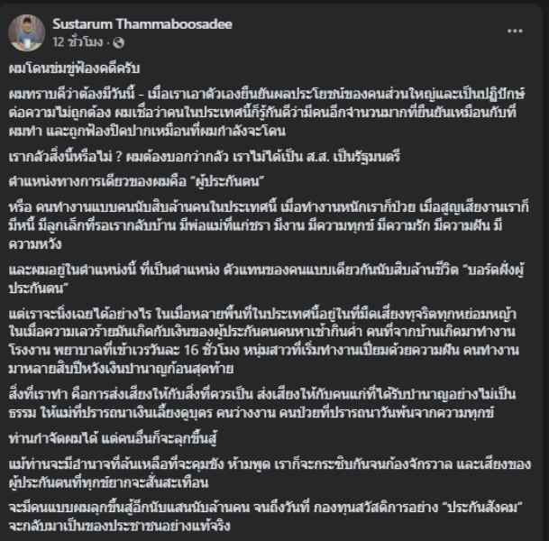 วันที่ 2 ก.พ.69 นายษัษฐรัมย์ ธรรมบุษดี กรรมการประกันสังคมในสัดส่วนผู้ประกันตน โพสต์ข้อความผ่านเฟซบุ๊ก Sustarum Thammaboosadee ระบุว่า...