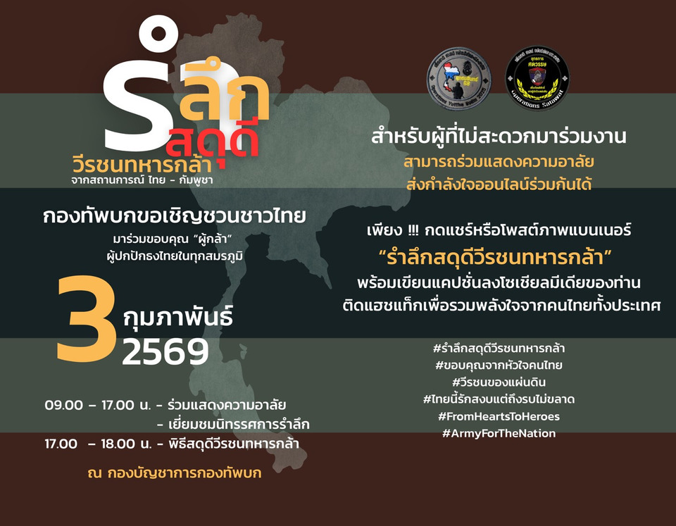 วันที่ 2 ก.พ.69 กองทัพบกเตรียมจัดพิธี “สดุดีวีรชนทหารกล้า” จากสถานการณ์ชายแดนไทย–กัมพูชา เนื่องในโอกาสวันทหารผ่านศึก ในวันอังคารที่ 3 กุมภาพันธ์ 2569 ณ กองบัญชาการกองทัพบก เพื่อร่วมรำลึกถึงวีรกรรมของทหารหาญผู้เสียสละชีวิตจากการปฏิบัติหน้าที่ในการพิทักษ์รักษาอธิปไตยและความมั่นคงของชาติ พร้อมเชิดชูเกียรติและประกาศคุณงามความดีของผู้ที่อุทิศตนเพื่อแผ่นดินไทย