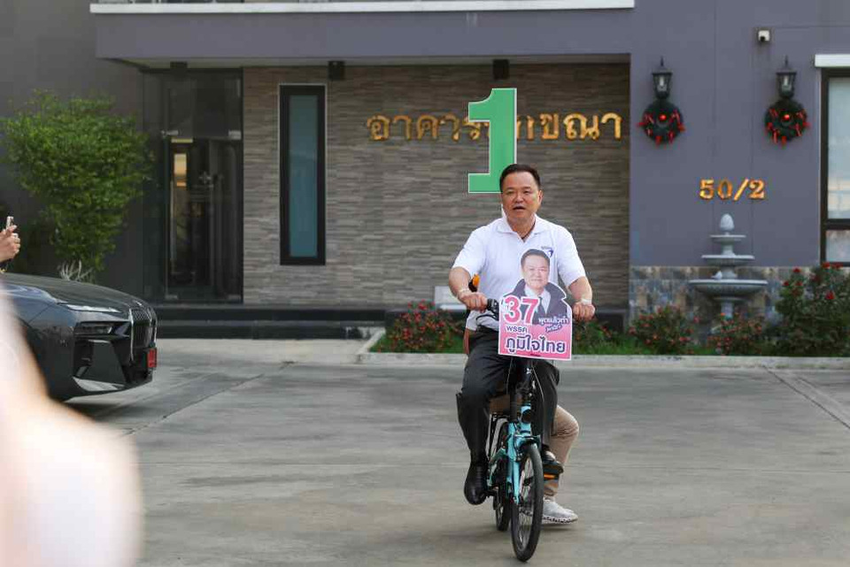 จากนั้นนายอนุทิน ได้เดินไปขึ้นคร่อมจักรยานที่มีป้ายหาเสียงเป็นรูปนายอนุทิน พร้อมหมายเลข 37 โดยมีน.ส.กัญญาพร ผู้สมัครสส.นั่งซ้อนท้าย ก่อนปั่นจักรยานในบริเวณดังกล่าว ท่ามกลางประชาชนมายืนถ่ายรูปอย่างสนุกสนาน ซึ่งมีประชาชนนำหมวกมาขอลายเซ็นนายอนุทิน นำสมุดมาให้เซ็นและหันหลังให้เซ็นลายเซ็นบนเสื้อ