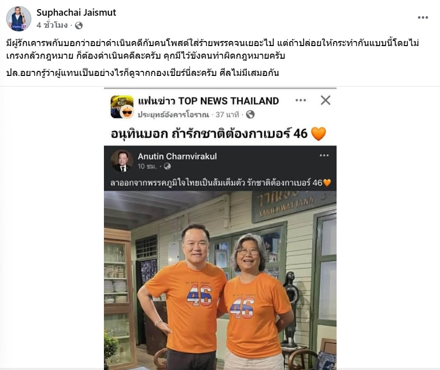 โดยนายศุภชัย ระบุว่า "มีผู้ที่รักเคารพกันบอกว่าอย่าดำเนินคดีกับคนโพสต์ใส่ร้ายพรรคจนเยอะไป แต่ถ้าปล่อยให้กระทำกันแบบนี้โดยไม่เกรงกลัวกฎหมาย ก็ต้องดำเนินคดีกัน คุกมีไว้ขังคนทำผิดกฎหมายครับ ปล.อยากรู้ว่าผู้แทนเป็นอย่างไรก็ดูจากกองเชียร์นี่ละครับ ศีลไม่มีเสมอกัน"