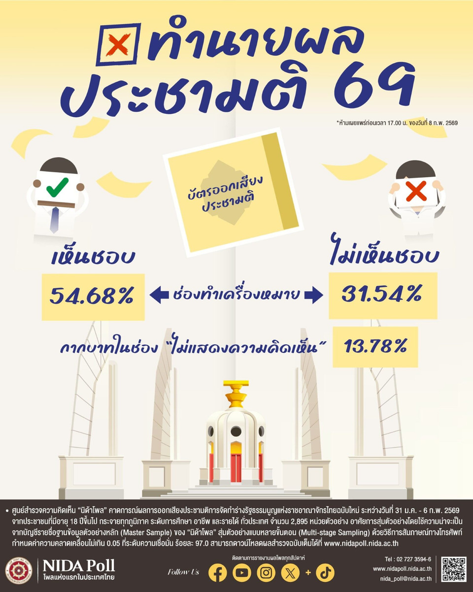 วันที่ 8 ก.พ.69 ศูนย์สำรวจความคิดเห็น “นิด้าโพล” สถาบันบัณฑิตพัฒนบริหารศาสตร์ (นิด้า) คาดการณ์ผลการออกเสียงประชามติการจัดทำร่างรัฐธรรมนูญแห่งราชอาณาจักรไทยฉบับใหม่ โดยทำการสำรวจระหว่างวันที่ 31 มกราคม - 6 กุมภาพันธ์ 2569 จากประชาชนที่มีอายุ 18 ปีขึ้นไป และมีสิทธิเลือกตั้ง กระจายทุกภูมิภาค ระดับการศึกษา อาชีพ และรายได้ ทั่วประเทศ รวมจำนวนทั้งสิ้น 2,895 หน่วยตัวอย่าง การสำรวจอาศัยการสุ่มตัวอย่างโดยใช้ความน่าจะเป็นจากบัญชีรายชื่อฐานข้อมูลตัวอย่างหลัก (Master Sample) ของ “นิด้าโพล” สุ่มตัวอย่างแบบหลายขั้นตอน (Multi-stage Sampling) โดยการเก็บข้อมูลด้วยวิธีการสัมภาษณ์ทางโทรศัพท์ และกำหนดค่าความคลาดเคลื่อนไม่เกิน 0.05 ที่ระดับความเชื่อมั่น ร้อยละ 97.0 ผลการสำรวจ ดังนี้