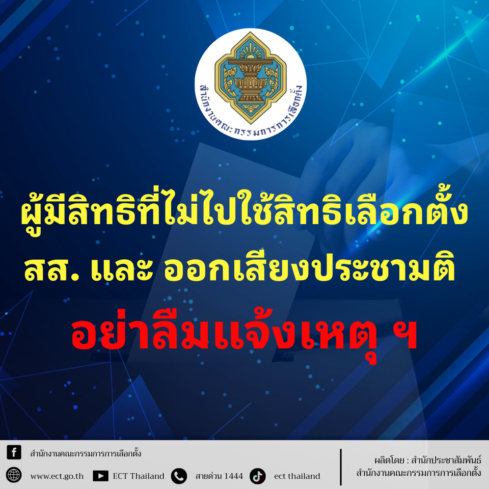 วันที่ 9 ก.พ.69 สำนักงานคณะกรรมการการเลือกตั้ง เตือนผู้มีสิทธิที่ไม่ไปใช้สิทธิเลือกตั้ง สส. และออกเสียงประชามติ เมื่อวานนี้ อย่าลืมแจ้งเหตุไม่ไปใช้สิทธิ สามารถแจ้งเหตุที่ไม่อาจไปใช้สิทธิ ระหว่างวันที่ 9 – 15 กุมภาพันธ์ 2569 ในกรณีไม่ได้ไปใช้สิทธิเลือกตั้ง สส. สามารถแจ้งผ่านช่องทางอิเล็กทรอนิกส์ผ่าน เว็บไซต์สำนักงาน กกต. www.ect.go.th หรือเว็บไซต์กรมการปกครอง https://boraservices.bora.dopa.go.th/election/abscausess/ หรือ แอปพลิเคชัน “ทางรัฐ” หรือแอปพลิเคชัน Smart Vote หรือพิมพ์คำว่าแจ้งเหตุการเลือกตั้ง สส. หรือยื่นด้วยตนเองต่อนายทะเบียนอำเภอ / นายทะเบียนท้องถิ่น ส่งทางไปรษณีย์ลงทะเบียน ทำเป็นหนังสือมอบหมายให้บุคคลอื่นไปยื่นแทน
