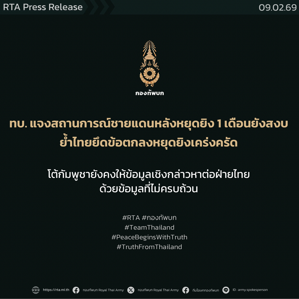 วันนี้ (9 กุมภาพันธ์ 2569) ที่กองบัญชาการกองทัพบก พลตรี วินธัย สุวารี โฆษกกองทัพบก กล่าวถึงสถานการณ์ในพื้นที่ชายแดนไทย–กัมพูชา หลังจากที่มีข้อตกลงหยุดยิง ตามผลการประชุมคณะกรรมาธิการชายแดนทั่วไป (General Border Committee : GBC) ไทย–กัมพูชา สมัยพิเศษ เมื่อวันที่ 27 ธันวาคม 2568 ซึ่งปัจจุบันทั้งสองฝ่ายได้ดำเนินการตามข้อตกลงมาเป็นเวลากว่า 1 เดือนแล้วว่า