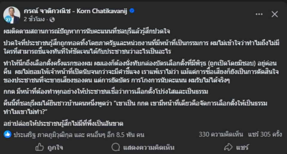 ผมติดตามสถานการณ์ปัญหาการนับคะแนนที่ชลบุรีแล้วรู้สึกปวดใจ
