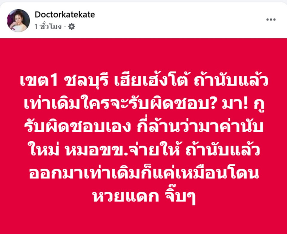 #หมอของขวัญ #ของขวัญฟูจิตนิรันดร์ #Doctorkatekate #ชลบุรีเขต1 #ชลบุรี #นับคะแนนใหม่ #เลือกตั้ง2569 #เลือกตั้งจบแต่นับไม่จบ #กกต #กกตกลาง #สุชาติชมกลิ่น #ภูมิใจไทย #พิรุธเลือกตั้ง #ความโปร่งใส #ตรวจสอบเลือกตั้ง #เงินล้าน #ท้าชน #โซเชียลเดือด #การเมืองไทย #ข่าวการเมือง #จุดร้อนการเมือง #เลือกตั้งเดือด #ข่าวด่วน #ข่าววันนี้