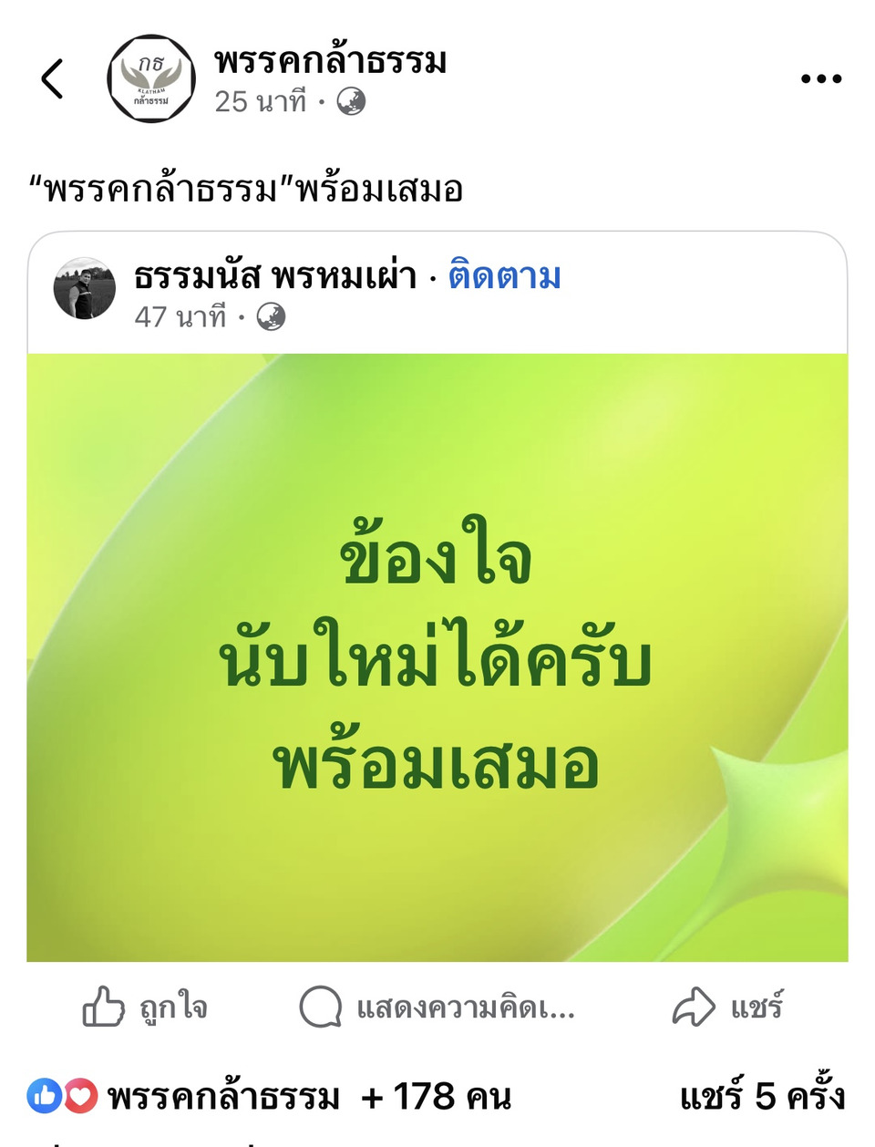 ขณะที่เพจเฟซบุ๊กพรรคกธ.ได้แชร์โพสต์ข้อความดังกล่าวของร.อ.ธรรมนัส และโพสต์ข้อความว่า “พรรคกล้าธรรรม”พร้อมเสมอ