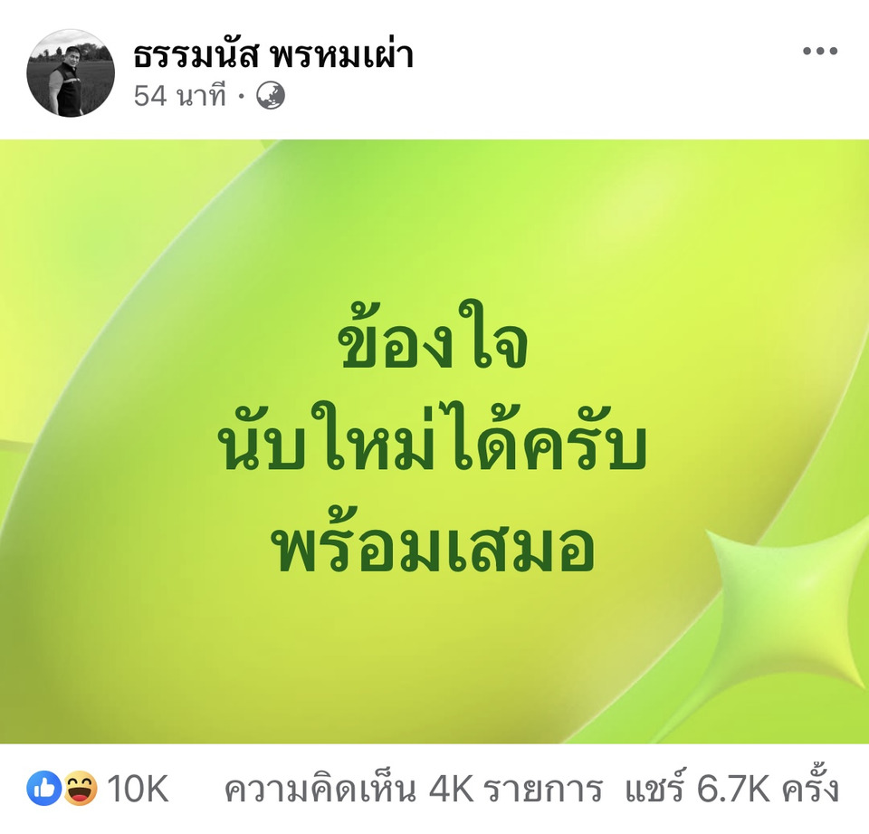 เมื่อเวลา 17.25 น.วันที่ 10 ก.พ. 69 ร.อ.ธรรมนัส พรหมเผ่า ประธานที่ปรึกษาพรรคกล้าธรรม (กธ.) โพสต์ข้อความที่มีพื้นหลังเป็นสีเขียวสั้นๆ หลังเกิดกระแสเรียกร้องนับคะแนนเลือกตั้งใหม่ ว่า "ข้องใจ นับใหม่ได้ครับ พร้อมเสมอ"