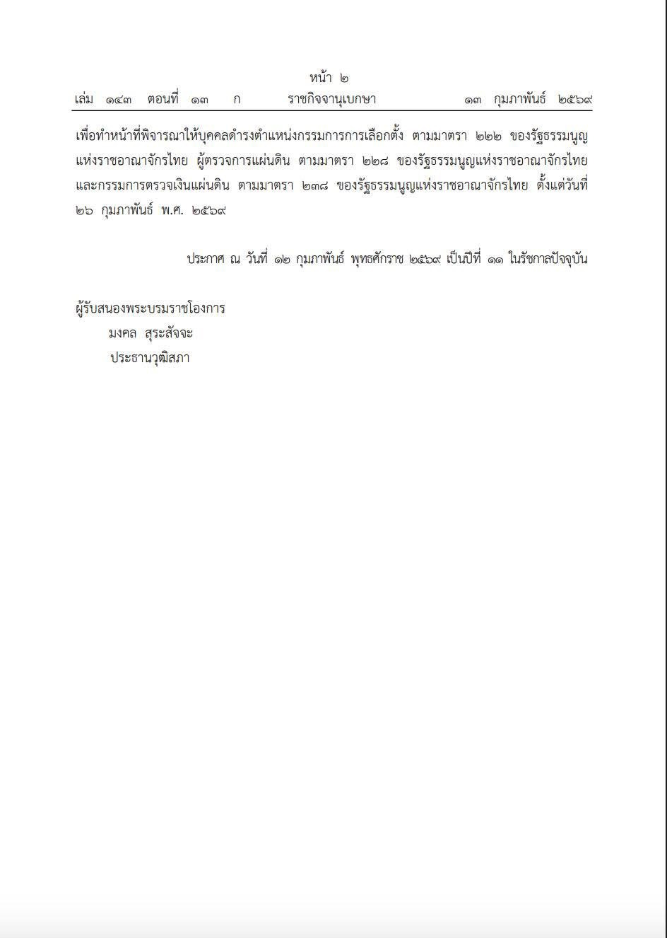 ประกาศ ณ วันที่ 12 กุมภาพันธ์ พุทธศักราช 2569 เป็นปีที่ 11 ในรัชกาลปัจจุบัน ผู้รับสนองพระบรมราชโองการ มงคล สุระสัจจะ ประธานวุฒิสภา