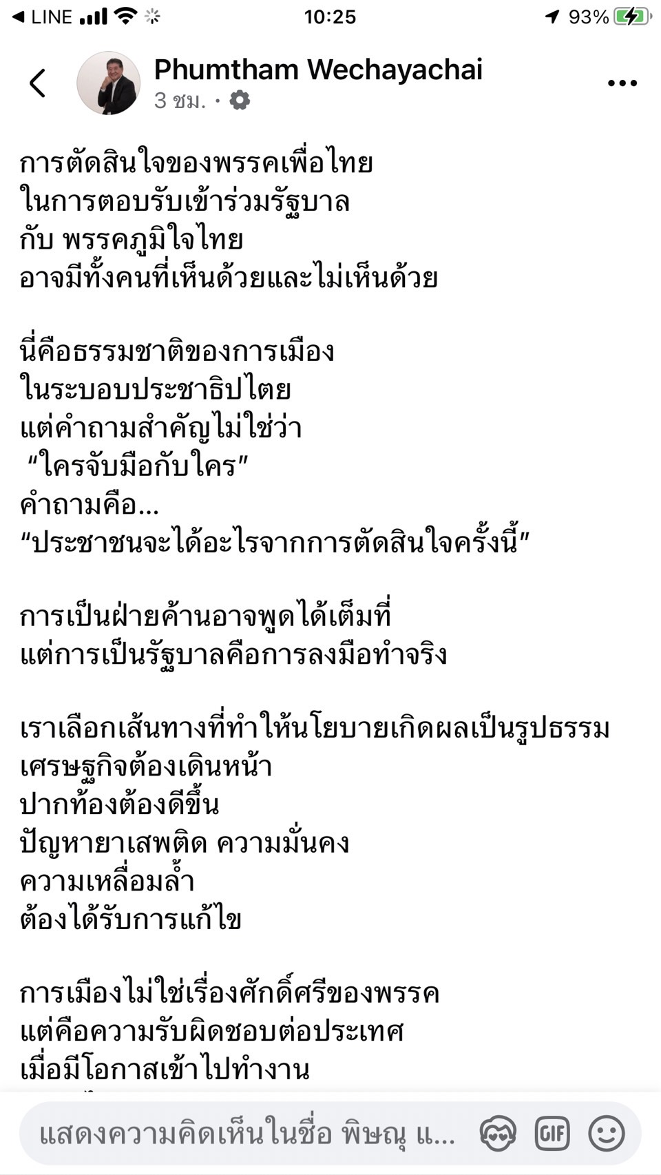 การเมืองไม่ใช่เรื่องศักดิ์ศรีของพรรค แต่คือความรับผิดชอบต่อประเทศ เมื่อมีโอกาสเข้าไปทำงาน เราจะไม่ยืนดูอยู่ข้างสนาม อย่างไรก็ตาม เราเคารพและรับฟังเหตุผลของทุกความเห็นต่าง โดยเฉพาะเสียงของผู้สนับสนุนที่แสดงความกังวลต่อการเข้าร่วมรัฐบาลครั้งนี้