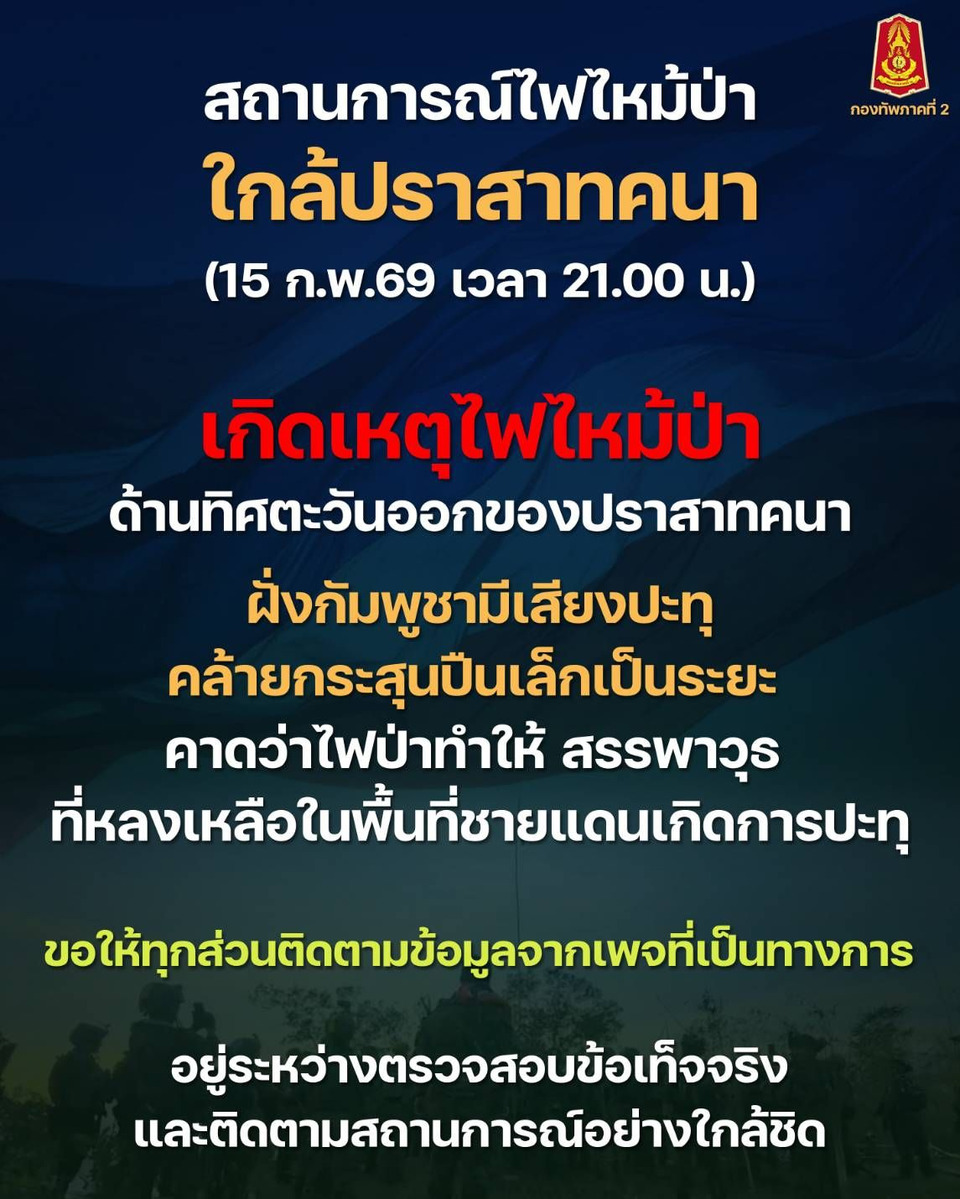 ล่าสุดเพจกองทัพภาคที่ 2 โพสต์ข้อความระบุว่า เกิดเหตุไฟไหม้ป่าด้านทิศตะวันออกของปราสาทคนา ฝั่งกัมพูชามีเสียงปะทุ คล้ายกระสุนปืนเล็กเป็นระยะ คาดว่าไฟป่าทำให้ สรรพาวุธที่หลงเหลือในพื้นที่ชายแดนเกิดการปะทุ ขอให้ทุกส่วนติดตามข้อมูลจากเพจที่เป็นทางการ อยู่นะหว่างการตรวจสอบข้อเท็จจริง และติดตามสถานการณ์อย่างใกล้ชิด