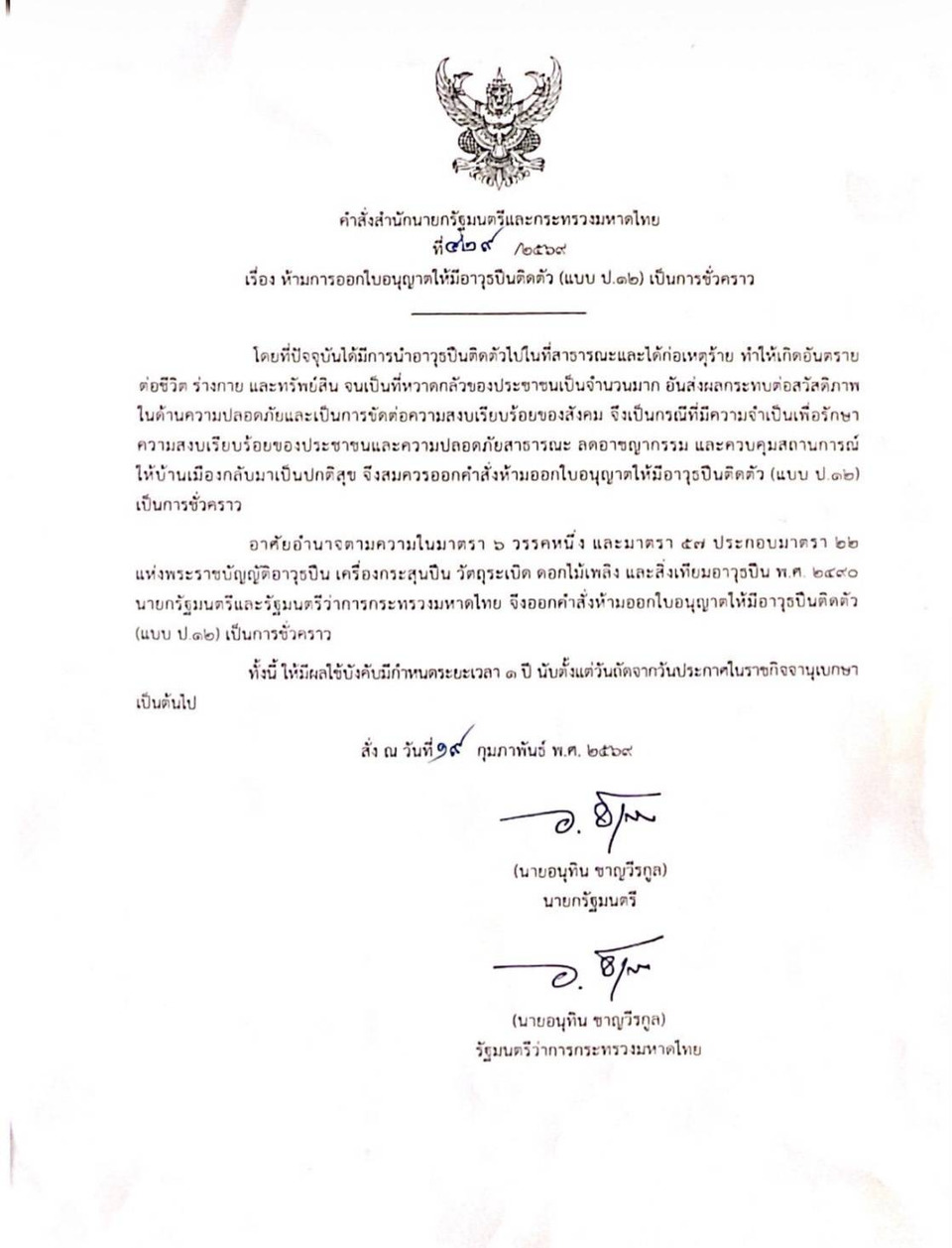 วันที่ 20 ก.พ.2569 นายอนุทิน ชาญวีรกูล นายกรัฐมนตรี และรมว.มหาดไทย ได้ลงนามในคำสั่งสำนักนายกรัฐมนตรีและกระทรวงมหาดไทย ที่429/2569 วันที่19ก.พ.ที่ผ่านมา เรื่อง ห้ามการออกใบอนุญาตให้มีอาวุธปืนติดตัว (แบบ ป.12) เป็นการชั่วคราว มีเนื้อหาระบุว่า โดยที่ปัจจุบันได้มีการนำอาวุธปืนติดตัวไปในที่สาธารณะและได้ก่อเหตุร้าย ทำให้เกิดอันตราย ต่อชีวิต ร่างกาย และทรัพย์สิน จนเป็นที่หวาดกลัวของประชาขนเป็นจำนวนมาก อันส่งผลกระทบต่อสวัสติภาพในด้านความปลอดภัยและเป็นการขัดต่อความสงบเรียบร้อยของสังคม