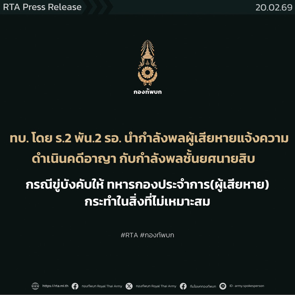 วันที่ 20 ก.พ.69 กองทัพบกโดย กองพันทหารราบที่ 2 กรมทหารราบที่ 2 รักษาพระองค์ นำกำลังพลผู้เสียหายเข้าแจ้งความดำเนินคดีอาญา กับกำลังพลชั้นยศนายสิบ กรณีที่ไปขู่บังคับให้ กำลังพลทหารกองประจำการ ซึ่งเป็นผู้เสียหาย กระทำในสิ่งที่ไม่เหมาะสม