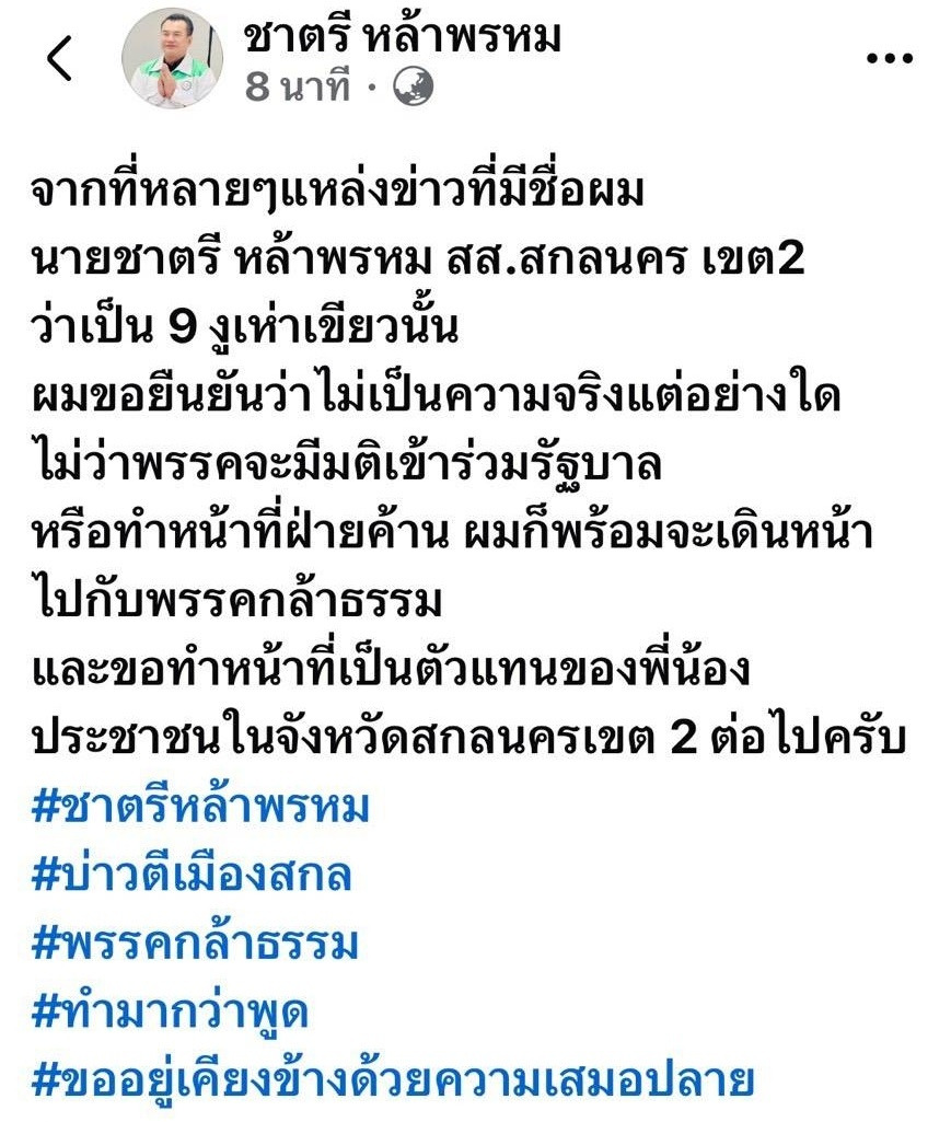 วันนี้ ( 26 ก.พ.) เมื่อเวลา 20.00 น. นายชาตรี หล้าพรหม สส.สกลนคร เขต 2 พรรคกล้าธรรม ชี้แจงผ่านเฟซบุ๊กส่วนตัว ภายหลังมีกระแสข่าวจากสื่อหลายสำนักระบุว่า เป็นหนึ่งใน “9 งูเห่า” ที่จะย้ายขั้วทางการเมือง โดยยืนยันอย่างชัดเจนว่า ข่าวดังกล่าวไม่เป็นความจริงแต่อย่างใด