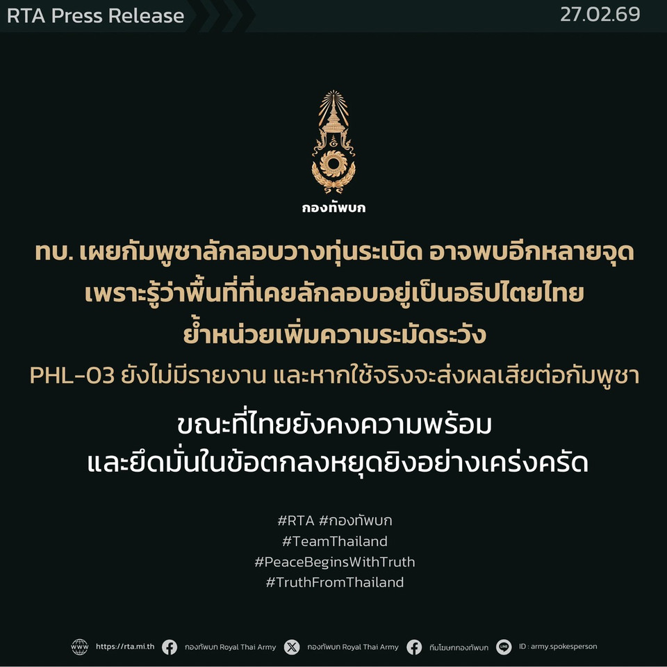 สำหรับกระแสข่าวเกี่ยวกับความเคลื่อนไหวอาวุธ PHL-03 จากฝั่งกัมพูชาที่มีประชาชนบางส่วนกังวลนั้น