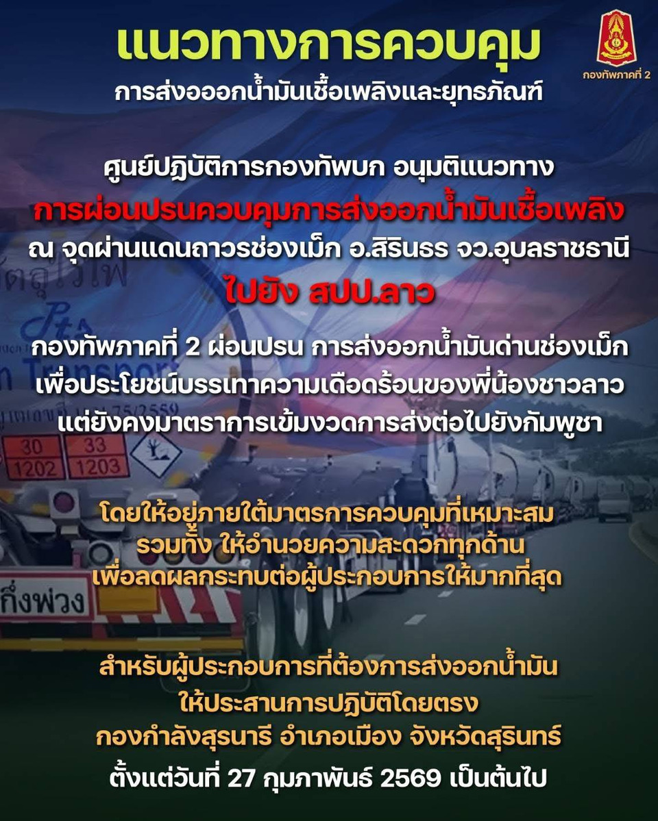 วันที่ 27 ก.พ.69 เพจกองทัพภาคที่ 2 รายงานว่า ศูนย์ปฏิบัติการกองทัพบก อนุมติแนวทางการผ่อนปรนควบคุมการส่งออกน้ำมันเชื้อเพลิง ณ จุดผ่านแดนถาวรช่องเม็ก อ.สิรินธร จ.อุบลราชธานี ไปยัง สปป.ลาว