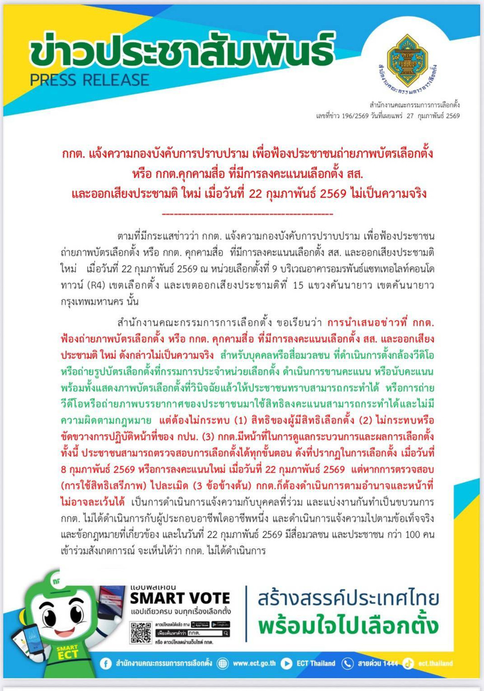วันนี้(27ก.พ.)สำนักงานกกตได้ออกเอกสารชี้แจง กรณีมีการนำเสนอข่าวว่า การที่ กกต.แจ้งความกองบังคับการปราบปราม เป็นการฟ้องประชาชนถ่ายภาพบัตรเลือกตั้ง หรือ กกต. คุกคามสื่อนั้นไม่เป็นความจริง สำหรับบุคคลหรือสื่อมวลชน ที่ดำเนินการตั้งกล้องวีดิโอหรือถ่ายรูปบัตรเลือกตั้งที่กรรมการประจำหน่วยเลือกตั้ง ดำเนินการขานคะแนน หรือนับคะแนน พร้อมทั้งแสดงภาพบัตรเลือกตั้งที่วินิจฉัยแล้วให้ประชาชนทราบสามารถกระทำได้ หรือการถ่ายวีดีโอหรือถ่ายภาพบรรยากาศของประชาชนมาใช้สิทธิลงคะแนนสามารถกระทำได้และไม่มีความผิดตามกฎหมาย แต่ต้องไม่กระทบ (1) สิทธิของผู้มีสิทธิเลือกตั้ง (2) ไม่กระทบหรือขัดขวางการปฏิบัติหน้าที่ของ กปน. (3) กกต.มีหน้าที่ในการดูแลกระบวนการและผลการเลือกตั้ง ทั้งนี้ ประชาชนสามารถตรวจสอบการเลือกตั้งได้ทุกขั้นตอน ดังที่ปรากฏในการเลือกตั้ง เมื่อวันที่ 8 กุมภาพันธ์ 2569 หรือการลงคะแนนใหม่ เมื่อวันที่ 22 กุมภาพันธ์ 2569 แต่หากการตรวจสอบ (การใช้สิทธิเสรีภาพ) ไปละเมิด (3 ข้อข้างต้น) กกต.ก็ต้องดำเนินการตามอำนาจและหน้าที่ ไม่อาจละเว้นได้