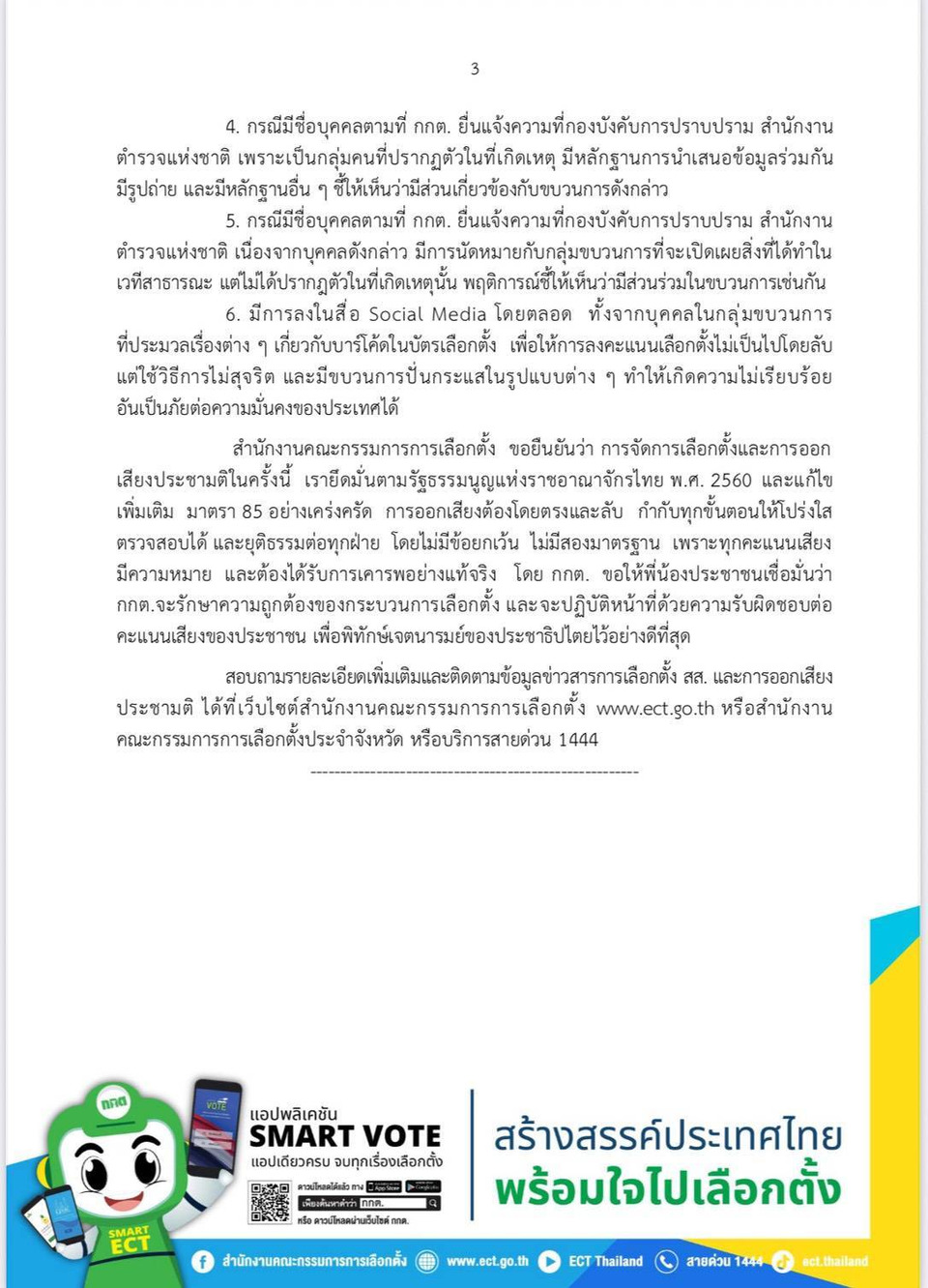 6. มีการลงในสื่อ Social Media โดยตลอด ทั้งจากบุคคลในกลุ่มขบวนการ ที่ประมวลเรื่องต่าง ๆ เกี่ยวกับบาร์โค้ดในบัตรเลือกตั้ง เพื่อให้การลงคะแนนเลือกตั้งไม่เป็นไปโดยลับ แต่ใช้วิธีการไม่สุจริต และมีขบวนการปั่นกระแสในรูปแบบต่าง ๆ ทำให้เกิดความไม่เรียบร้อย อันเป็นภัยต่อความมั่นคงของประเทศได้