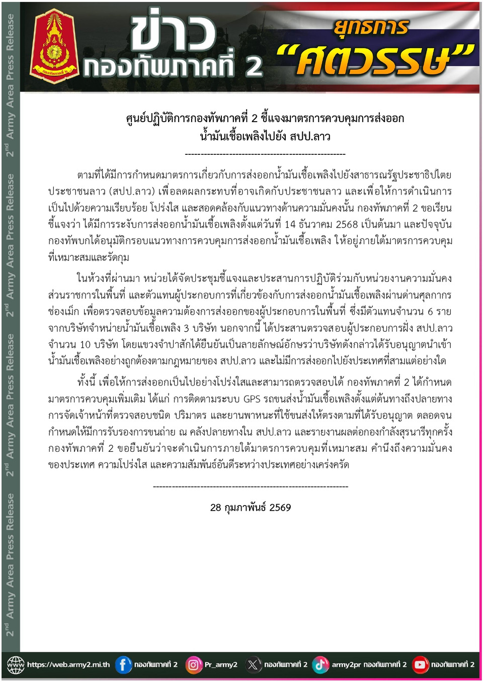 กองทัพภาคที่ 2 ขอเรียนชี้แจงว่า ได้มีการระงับการส่งออกน้ำมันเชื้อเพลิงตั้งแต่วันที่ 14 ธันวาคม 2568 เป็นต้นมา และปัจจุบันกองทัพบกได้อนุมัติกรอบแนวทางการควบคุมการส่งออกน้ำมันเชื้อเพลิง ให้อยู่ภายใต้มาตรการควบคุมที่เหมาะสมและรัดกุม
