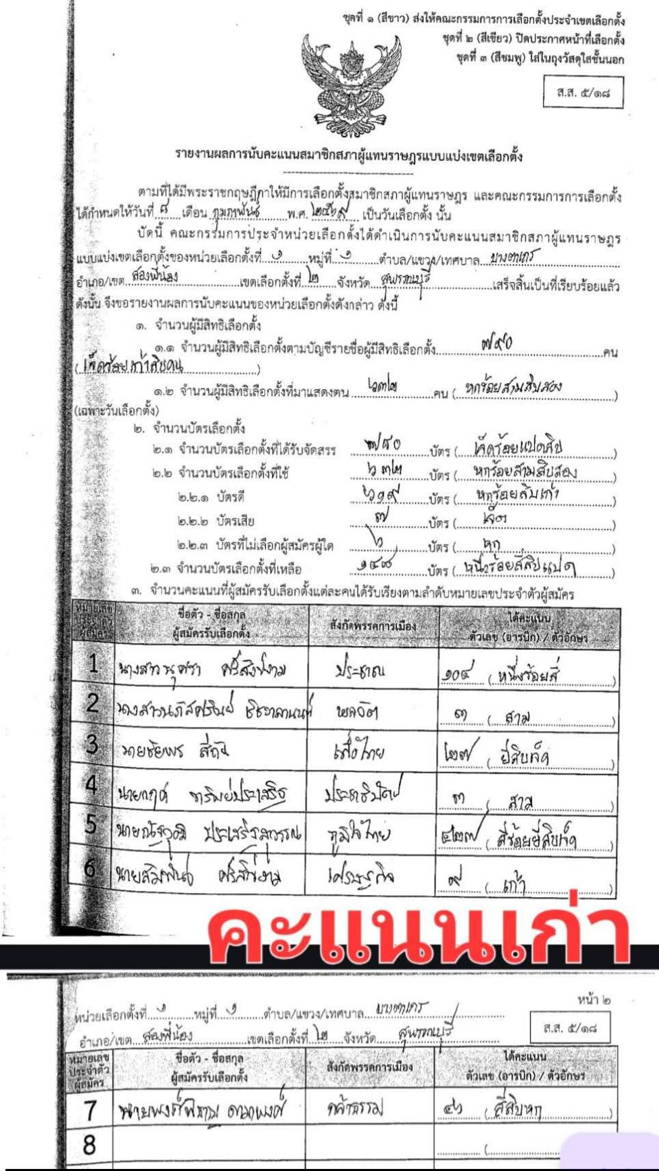 นายณัฐพงษ์ เรืองปัญญาวุฒิ หัวหน้าพรรคประชาชนแชร์ภาพในเฟสบุ๊ก ผลการนับคะแนนใหม่ของหน่วยเลือกต้งที่ 1 ต.บางตาเถร อ.สองพี่น้อง จ.สุพรรณบุรี โดยพบว่า ผลจากหน่วยดังกล่าว อันดับ 1 ผู้สมัครจากพรรคภูมิใจไทย จาก 427 คะแนน เหลือ 263 คะแนน ส่วนอันดับ 2 ผู้สมัครจากพรรคประชาชน จาก 104 คะแนน เป็น 228 คะแนน