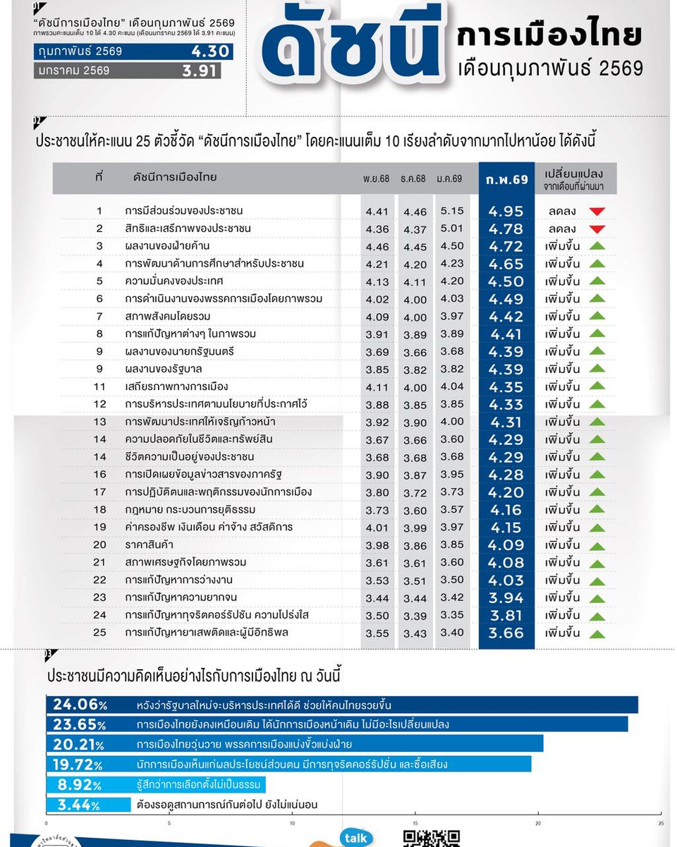 เมื่อวันที่ 1 มีนาคม 2569 สรุปผลการสำรวจ : “ดัชนีการเมืองไทย เดือนกุมภาพันธ์ 2569”สวนดุสิตโพล มหาวิทยาลัยสวนดุสิต สำรวจความคิดเห็นประชาชนทั่วประเทศ เรื่อง “ดัชนีการเมืองไทยประจำเดือนกุมภาพันธ์ 2569” กลุ่มตัวอย่าง จำนวน 2,277 คน (สำรวจทางออนไลน์และภาคสนาม) ระหว่างวันที่ 24-27 กุมภาพันธ์ 2569 พบว่า กลุ่มตัวอย่างให้คะแนนภาพรวมดัชนีการเมืองไทยประจำเดือนกุมภาพันธ์ เฉลี่ย 4.30 คะแนนเพิ่มขึ้นจากเดือนมกราคม 2569 ที่ได้ 3.91 คะแนน ตัวชี้วัดที่ได้คะแนนสูงสุด คือ การมีส่วนร่วมของประชาชนได้คะแนนเฉลี่ย 4.95 คะแนน ตัวชี้วัดที่ได้คะแนนต่ำสุด คือการแก้ปัญหายาเสพติดและผู้มีอิทธิพล ได้คะแนนเฉลี่ย 3.66คะแนน ทั้งนี้ความเห็นต่อการเมืองไทย ณ วันนี้ คือ หวังว่ารัฐบาลใหม่จะบริหารประเทศได้ดี ช่วยให้คนไทยรวยขึ้น ร้อยละ 24.06 รองลงมาคือ มองว่าการเมืองไทยยังคงเหมือนเดิม ได้นักการเมืองหน้าเดิม ไม่มีอะไรเปลี่ยนแปลง ร้อยละ 23.65 การเมืองไทยวุ่นวาย พรรคการเมืองแบ่งขั้วแบ่งฝ่าย ร้อยละ 20.21