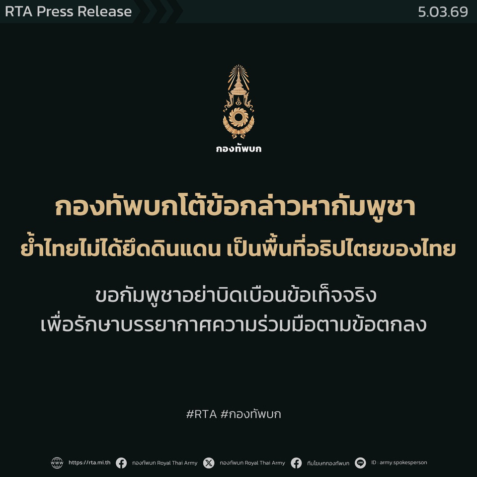 ทั้งนี้ ฝ่ายไทยยึดมั่นในข้อตกลงหยุดยิงและกรอบความร่วมมือที่ทั้งสองประเทศได้ตกลงร่วมกันอย่างเคร่งครัด โดยมุ่งรักษาความมั่นคงตามแนวชายแดนเพื่อความปลอดภัยของกำลังพลและประชาชนในพื้นที่ เคารพกฎหมายระหว่างประเทศ และยึดมั่นในหลักมนุษยธรรม พร้อมทั้งสนับสนุนการแก้ไขปัญหาผ่านกลไกความร่วมมือและการเจรจาระหว่างสองประเทศ โดยเห็นว่าการสื่อสารในประเด็นที่อ่อนไหวควรตั้งอยู่บนข้อเท็จจริงและความรับผิดชอบ เพื่อรักษาบรรยากาศและไม่ให้เกิดความเข้าใจผิดระหว่างกัน