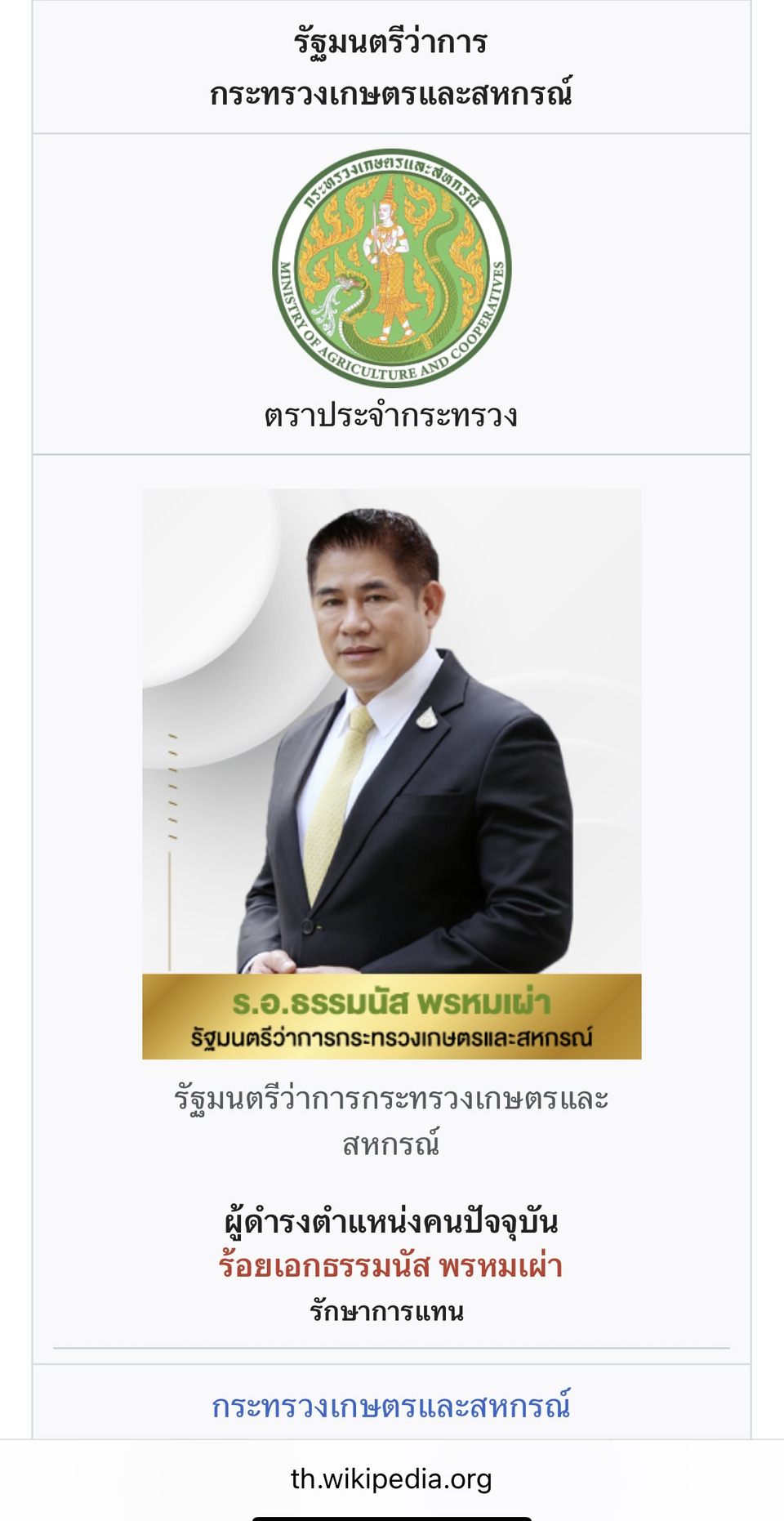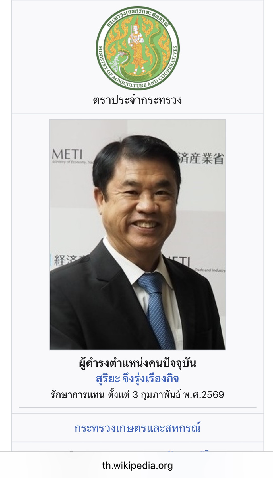 วันที่ 6 มี.ค. 69 ที่อาคารรัฐสภา ร.อ.ธรรมนัส พรหมเผ่า รัฐมนตรีว่าการกระทรวงเกษตรและสหกรณ์ ให้สัมภาษณ์ถึงกรณีเว็บไซต์วิกิพีเดียมีการเปลี่ยนแปลงข้อมูล รัฐมนตรีว่าการกระทรวงเกษตรและสหกรณ์ โดยระบุว่า ผู้ดำรงตำแหน่งคนปัจจุบัน นายสุริยะ จึงรุ่งเรืองกิจ รักษาการแทนตั้งแต่ วันที่ 3 กุมภาพันธ์ พ.ศ.2569 โดยร.อ.ธรรมนัส กล่าวเพียงสั้น ๆ ว่า “ไม่ทราบ”