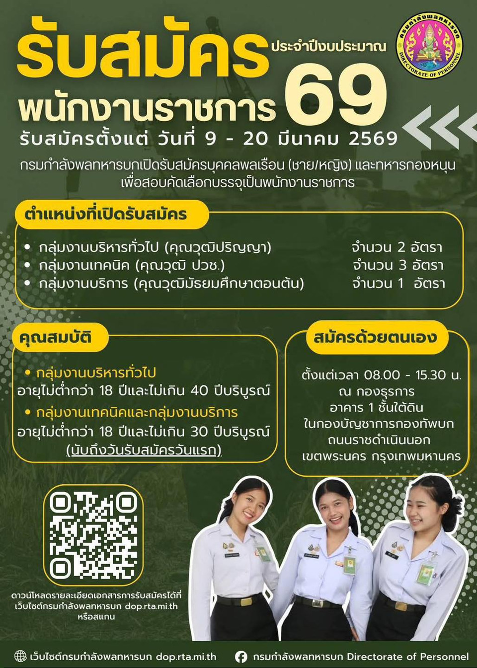 สมัครด้วยตนเอง เวลา 08.00 – 15.30 น. ณ กองธุรการ อาคาร 1 ชั้นใต้ดิน กองบัญชาการกองทัพบก ถนนราชดำเนินนอก เขตพระนคร กรุงเทพมหานคร
