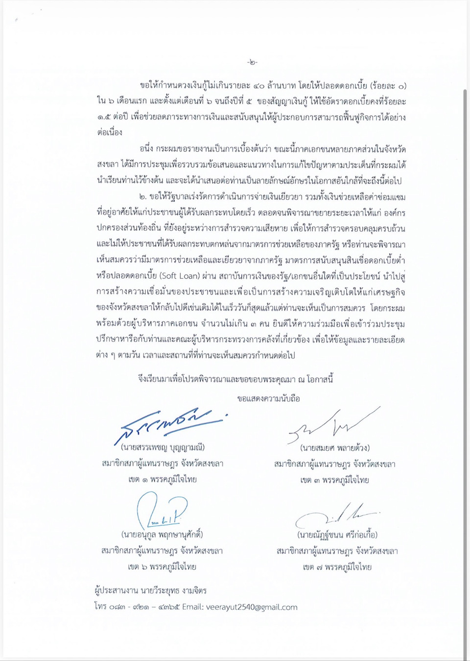 ด้วยเหตุนี้ สมาชิกสภาผู้แทนราษฎรจังหวัดสงขลาจากพรรคภูมิใจไทยจึงได้เสนอให้รัฐบาลพิจารณามาตรการสนับสนุนสินเชื่อดอกเบี้ยต่ำ หรือ Soft Loan ผ่านสถาบันการเงินของรัฐ เพื่อช่วยเหลือผู้ประกอบการที่ได้รับผลกระทบจากอุทกภัย โดยเสนอให้ปรับเพิ่มวงเงินสินเชื่อจากเดิมที่กำหนดไว้ไม่เกินรายละ 1 ล้านบาท เป็นไม่เกินรายละ 40 ล้านบาท เพื่อให้สอดคล้องกับระดับความเสียหายที่เกิดขึ้นจริงในพื้นที่