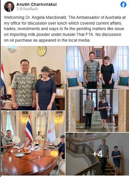 ต้อนรับ Dr. Angela Macdonald เอกอัครราชทูตออสเตรเลียที่สํานักงานของฉันสําหรับการอภิปรายในอาหารกลางวันซึ่งครอบคลุมถึงกิจการปัจจุบัน การค้า การลงทุน และวิธีการแก้ไขปัญหาที่ค้างคา เช่น ปัญหาเกี่ยวกับการนําเข้านมผงภายใต้ FTA ของออสซี-ไทย ไม่มีการอภิปรายเกี่ยวกับการซื้อน้ํามันตามที่ปรากฏในสื่อท้องถิ่น