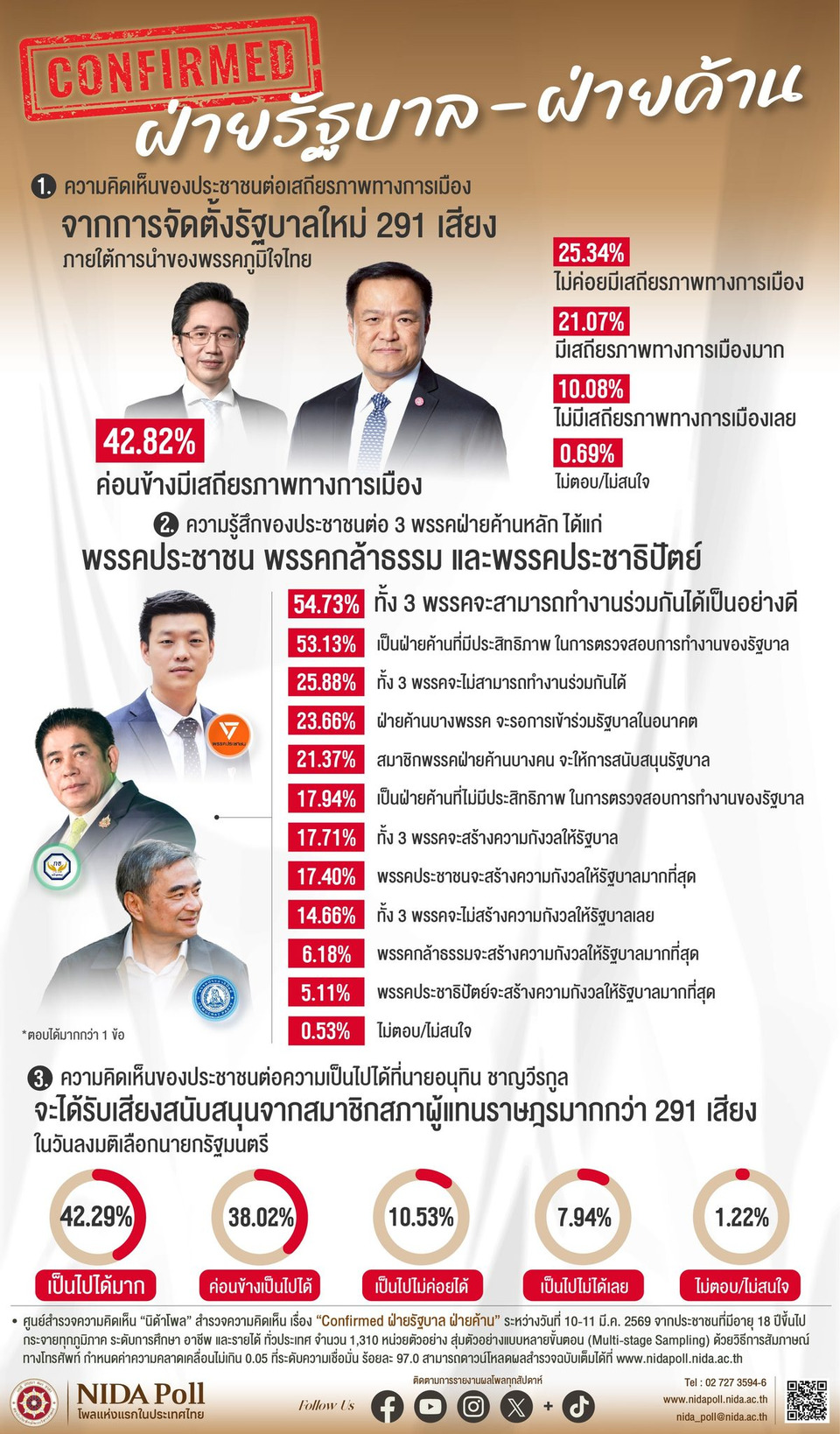 เมื่อวันที่15 มีนาคม 2569 ศูนย์สำรวจความคิดเห็น “นิด้าโพล” สถาบันบัณฑิตพัฒนบริหารศาสตร์ (นิด้า) เปิดเผยผลการสำรวจ เรื่อง “Confirmed ฝ่ายรัฐบาล ฝ่ายค้าน” ทำการสำรวจระหว่างวันที่ 10-11 มีนาคม 2569 จากประชาชนที่มี อายุ 18 ปีขึ้นไป กระจายทุกภูมิภาค ระดับการศึกษา อาชีพ และรายได้ ทั่วประเทศ รวมจำนวนทั้งสิ้น 1,310 หน่วยตัวอย่าง เกี่ยวกับความคิดเห็นของประชาชนต่อการจัดตั้งรัฐบาลใหม่ 291 เสียง ภายใต้การนำของพรรคภูมิใจไทย การสำรวจอาศัยการสุ่มตัวอย่างโดยใช้ความน่าจะเป็นจากบัญชีรายชื่อฐานข้อมูลตัวอย่างหลัก (Master Sample) ของ “นิด้าโพล” สุ่มตัวอย่างแบบหลายขั้นตอน (Multi-stage Sampling) เก็บข้อมูลด้วยวิธีการสัมภาษณ์ ทางโทรศัพท์ โดยกำหนดค่าความคลาดเคลื่อนไม่เกิน 0.05 ที่ระดับความเชื่อมั่น ร้อยละ 97.0