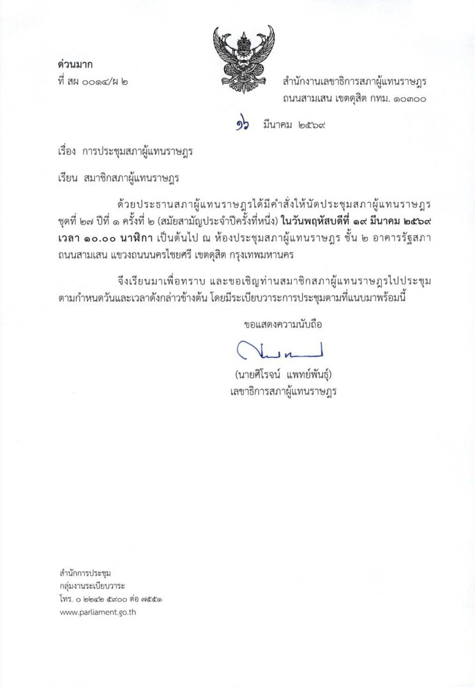 เมื่อวันที่ 16 มี.ค.69 นายศิโรจน์ แพทย์พันธุ์ เลขาธิการสภาผู้แทนราษฎร ได้ออกหนังสือด่วนมากที่ สผ 0014/ผ 2 ถึง สส. เรื่อง การประชุมสภาผู้แทนราษฎร เนื่องด้วยประธานสภาผู้แทนราษฎรได้มีคำสั่งให้นัดประชุมสภาผู้แทนราษฎร ชุดที่ 27 ปีที่ 1 ครั้งที่ 2 (สมัยสามัญประจำปีครั้งที่หนึ่ง) ในวันพฤหัสบดีที่ 19 มีนาคม 2569 เวลา 10.00น. เป็นต้นไป โดยมีระเบียบวาระ เรื่องที่ประธานแจ้งต่อที่ประชุม คือ รับทราบพระบรมราชโองการโปรดเกล้าฯ ประกาศแต่งตั้งประธานและรองประธานสภาผู้แทนราษฎร จากนั้นเข้าสู่เรื่องด่วน คือการพิจารณาให้ความเห็นชอบบุคคลซึ่งสมควรได้รับแต่งตั้งเป็นนายกรัฐมนตรี ตามมาตรา 159 ของรัฐธรรมนูญแห่งราชอาณาจักรไทย