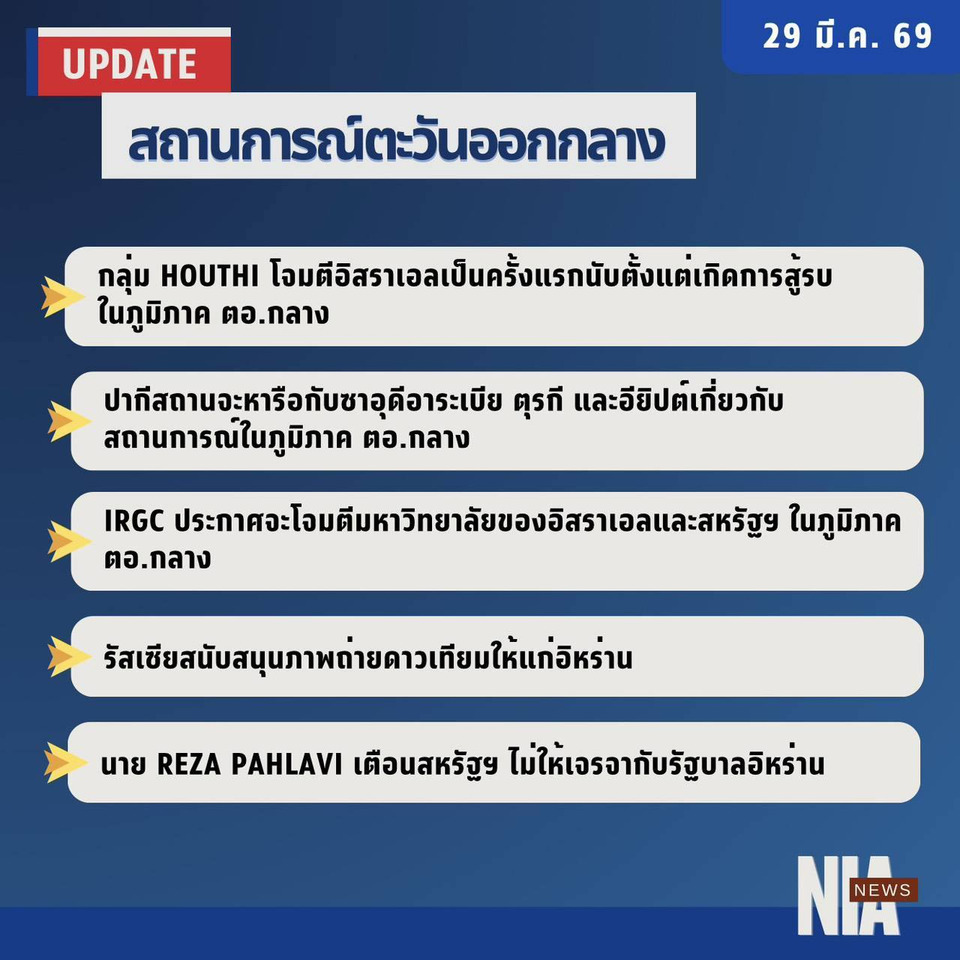 วันที่ 29 มี.ค.2569 เพจเฟซบุก สำนักข่าวกรองแห่งชาติ : National Intelligence Agency อัปเดตสถานการณ์ในภูมิภาคตะวันออกกลางประจำวัน