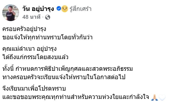 ทั้งนี้ กำหนดการพิธีบำเพ็ญกุศลและสวดพระอภิธรรม ทางครอบครัวจะเรียนแจ้งให้ทราบในโอกาสต่อไป จึงเรียนมาเพื่อโปรดทราบและขอขอบพระคุณทุกท่านสำหรับความห่วงใยและกำลังใจ"
