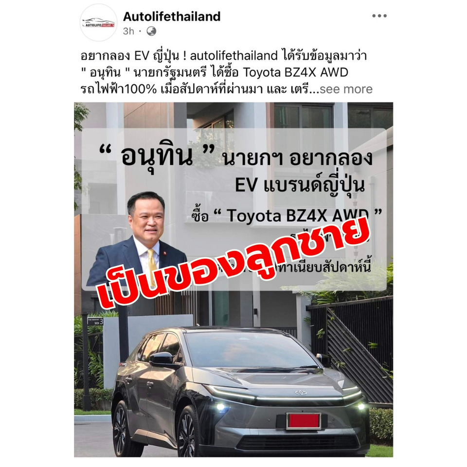 วันที่ 30 มีนาคม 2569 นางสาวรัชดา ธนาดิเรก ผู้ช่วยรัฐมนตรีประจำสำนักนายกรัฐมนตรี โพสต์เฟซบุ๊ก กรณีมีข่าวว่า นายอนุทิน ชาญวีรกูล นายกรัฐมนตรี ซื้อรถยนต์ไฟฟ้าคันใหม่เพิ่มอีกหนึ่งคัน ยี่ห้อ Toyota BZ4X AWD ว่า