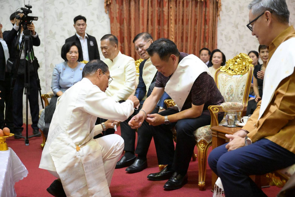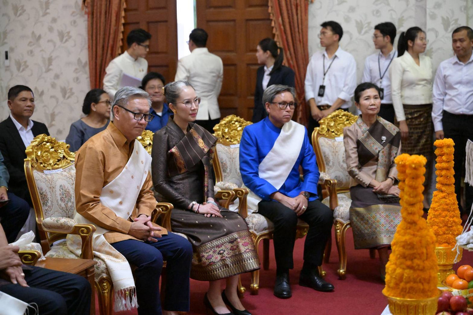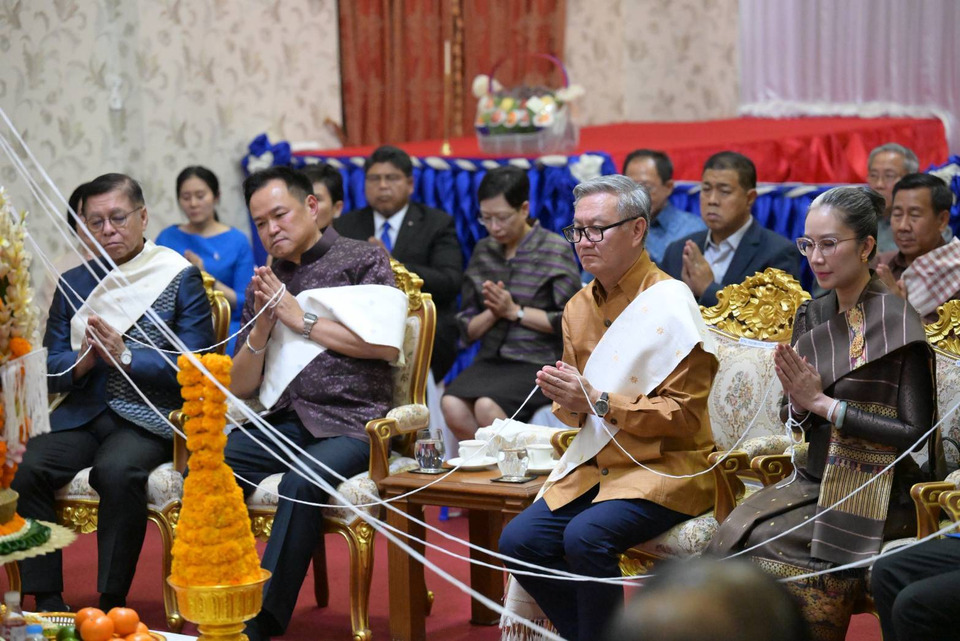 โอกาสนี้ นายกรัฐมนตรีได้มอบแจกันดอกไม้แสดงความยินดีแก่เอกอัครราชทูต สปป.ลาว ก่อนเข้าร่วมพิธีบายศรีสู่ขวัญ ณ ห้องโถงสโมสร ซึ่งเป็นพิธีสำคัญตามขนบธรรมเนียมลาว โดยมีพิธีสวดเรียกขวัญ การเจิมและทำน้ำมนต์ และผูกสายสิญจน์เพื่อความเป็นสิริมงคล