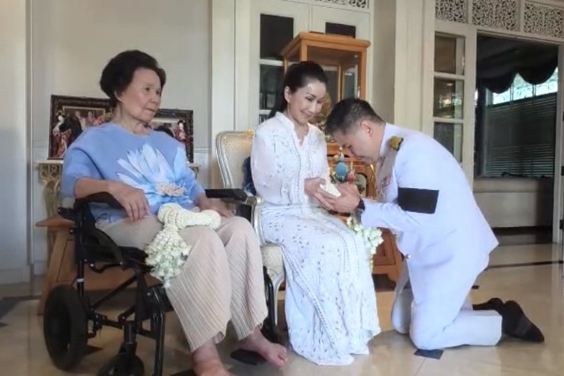 โดยนายวราวุธนำพวงมาลัยกราบคุณหญิงแจ่มใส พร้อมกล่าวว่า “ลูกชายมาขอพรแม่ครับ“ ซึ่งคุณหญิงแจ่มใส ได้กล่าวอวยพรว่า "คิดอะไรขอให้ได้ทุกสิ่งทุกอย่างที่ต้องการ"