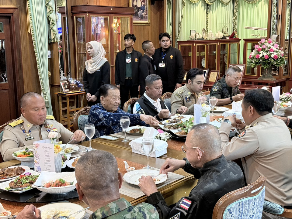 จากนั้น นายกรัฐมนตรี และคณะ ได้ร่วมโต๊ะรับทานอาหารกลางวัน โดยมี วันมูหะมัดนอร์, พล.อ.เกรียงไกร ศรีรักษ์ รองประธานวุฒิสภา อดีตแม่ทัพภาคที่ 4, นายพิพัฒน์ รัชกิจประการ รองนายกรัฐมนตรีและรัฐมนตรีว่าการกระทรวงคมนาคม, พล.ท.อดุลย์ บุญเจริญ รัฐมนตรีว่าการกระทรวงกลาโหม, พล.ต.ท.รุทธพล เนาวรัตน์ รัฐมนตรีว่าการกระทรวงยุติธรรม, นายประเสริฐ จันทรรวงทอง รัฐมนตรีว่าการกระทรวงศึกษาธิการ, นายภราดร ปริศนานันทกุล รัฐมนตรีประจำสำนักนายกรัฐมนตรี, นายเจเศรษฐ์ ไทยเศรษฐ์, นายวรศิษฐ์ เลียงประสิทธิ์ รัฐมนตรีช่วยว่าการกระทรวงมหาดไทย