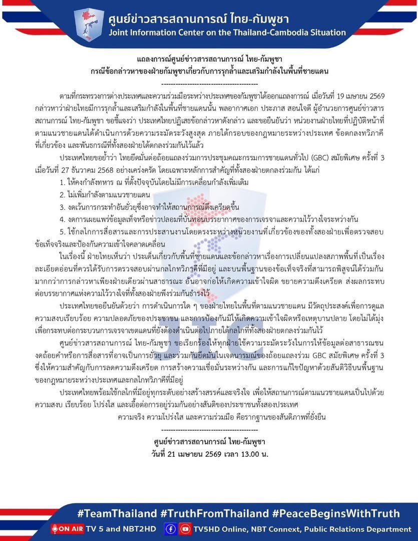 ขอยืนยันว่า การดำเนินการใด ๆ ของฝ่ายไทยในพื้นที่ตามแนวชายแดน มีวัตถุประสงค์เพื่อการดูแลความสงบเรียบร้อย ความปลอดภัยของประชาชน และการป้องกันมิให้เกิดความเข้าใจผิดหรือเหตุบานปลาย โดยไม่ได้มุ่งเพื่อกระทบต่อกระบวนการเจรจาเขตแดนที่ยังต้องดำเนินต่อไปภายใต้กลไกที่ทั้งสองฝ่ายตกลงร่วมกันไว้ศูนย์ข่าวสารสถานการณ์ ไทย-กัมพูชา