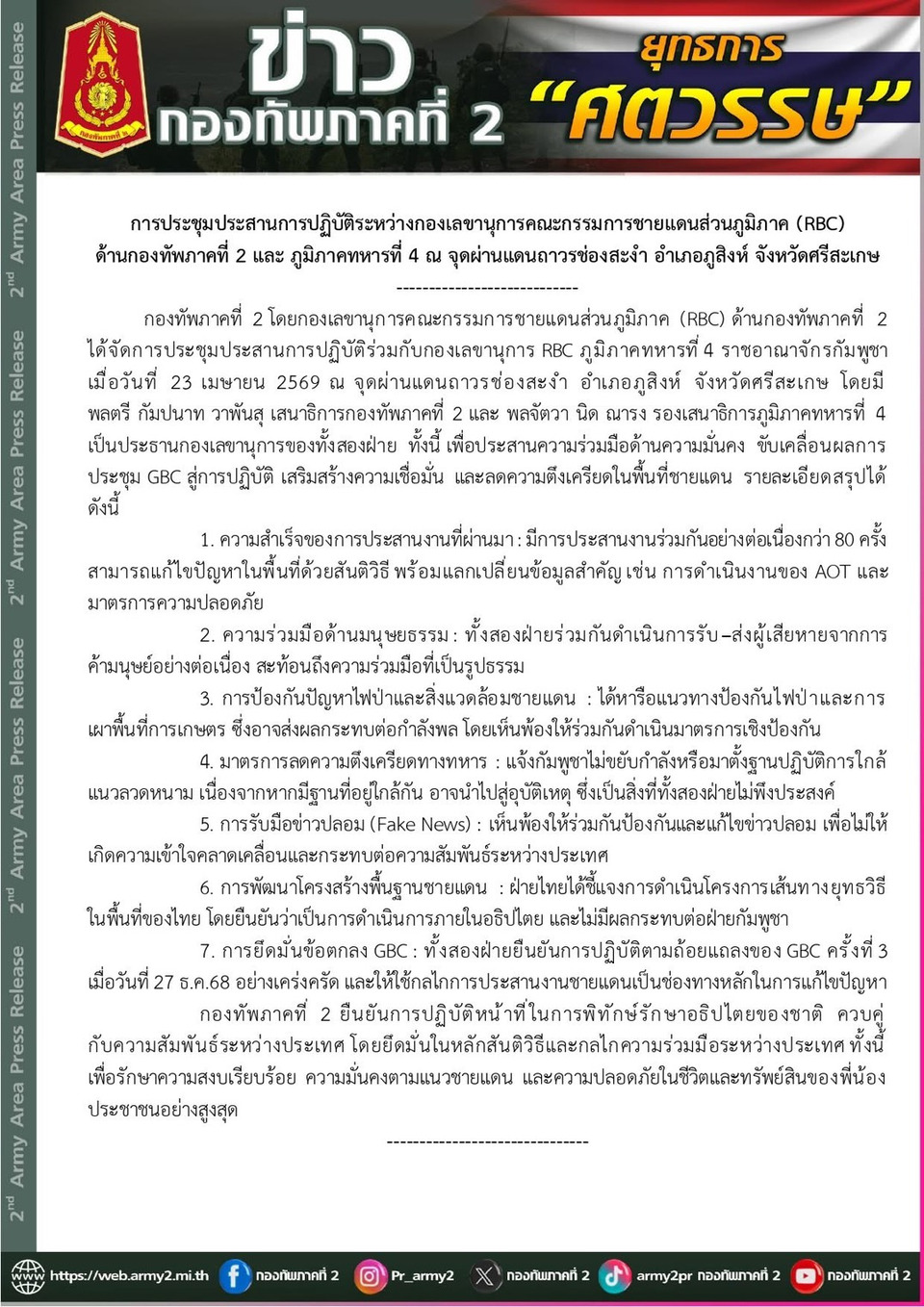 วันที่ 23 เม.ย.69 พลตรี กัมปนาท วาพันสุ เสนาธิการกองทัพภาคที่ 2 และ พลจัตวา นิด ณารง รองเสนาธิการภูมิภาคทหารที่ 4 เป็นประธาน การประชุมกองเลขานุการคณะกรรมการชายแดนส่วนภูมิภาค (RBC) ด้านกองทัพภาคที่ 2 โดยได้จัดการประชุมประสานการปฏิบัติร่วมกับกองเลขานุการ RBC ภูมิภาคทหารที่ 4 ราชอาณาจักรกัมพูชา ในวันนี้ 23 เมษายน 2569 ณ จุดผ่านแดนถาวรช่องสะงำ อำเภอภูสิงห์ จังหวัดศรีสะเกษ