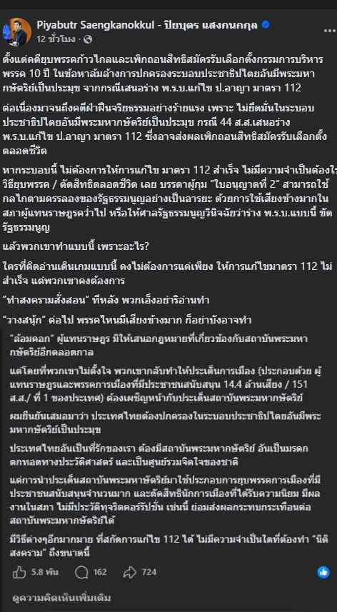 ใครที่คิดอ่านเดินเกมแบบนี้ คงไม่ต้องการแค่เพียง ให้การแก้ไขมาตรา 112 ไม่สำเร็จ แต่พวกเขาคงต้องการ
