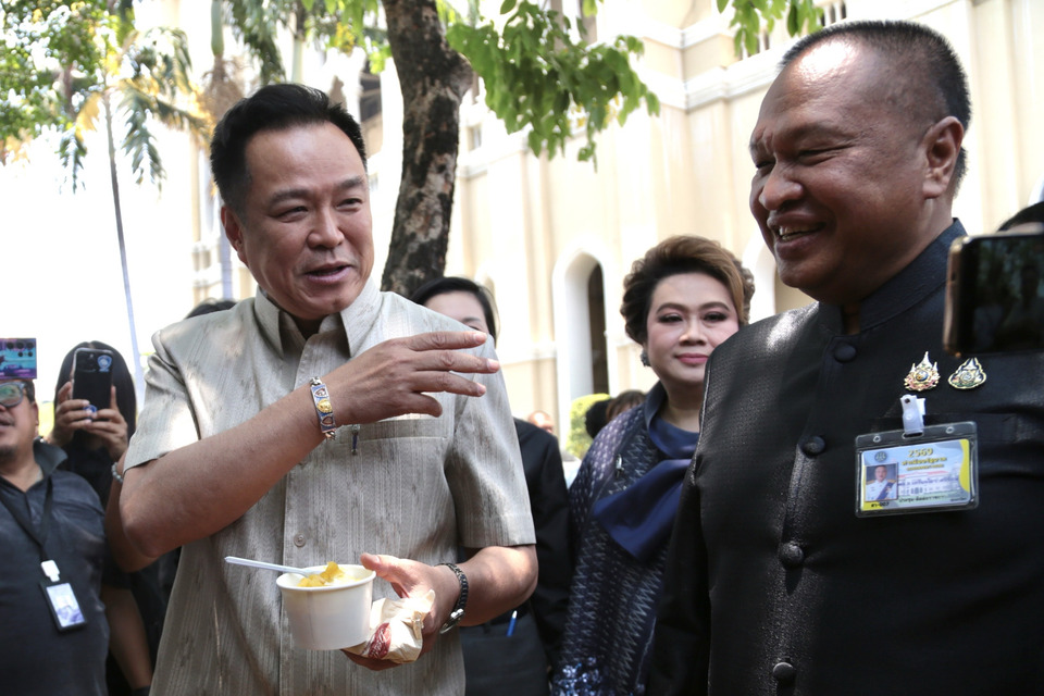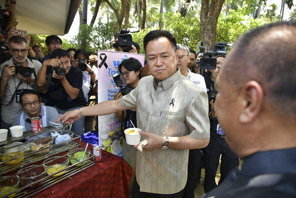 จากนั้น เวลา 12.00 น. นายอนุทิน ชาญวีรกูล นายกรัฐมนตรี และรมว.มหาดไทย ได้ลงจากตึกไทยคู่ฟ้า พร้อมกับพล.อ.เกรียงไกร ศรีรักษ์ รองประธานวุฒิสภา คนที่ 1 ในฐานะอดีตแม่ทัพภาคที่ 4 โดยนายกฯ เดินมาทักทายสื่อมวลชน ก่อนจะชิมขนมไทย และเดินไปตักไอติมกะทิใส่เครื่องด้วยตัวเองพร้อมระบุว่า"แปะก๊วยช่วยความจํา พ่อบังคับให้กินทุกเช้า มีวันนึง นั่งกินข้าวกับพี่เกรียง พี่เกรียงบอกว่าต้องกิน พี่หนูต้องกินแปะก๊วยทุกวัน ผมกินทุกวันความจําผมดี แล้วพี่เกรียง ก็หันไปถามภรรยาตัวเองว่าเมื่อเช้าพี่กินแล้วหรือยังน้อง" สร้างเสียงหัวเราะให้บรรดาทีมโฆษกและสื่อมวลชน ก่อนที่นายกฯจะกล่าวว่า ว่าวันนี้ไม่ได้มาร่วมนั่งกินด้วย เพราะต้องขึ้นไปเคลียร์งานที่ค้างอยู่บนตึกไทยคู่ฟ้า แค่แวะมาทักทายและกินไอศกรีมด้วย