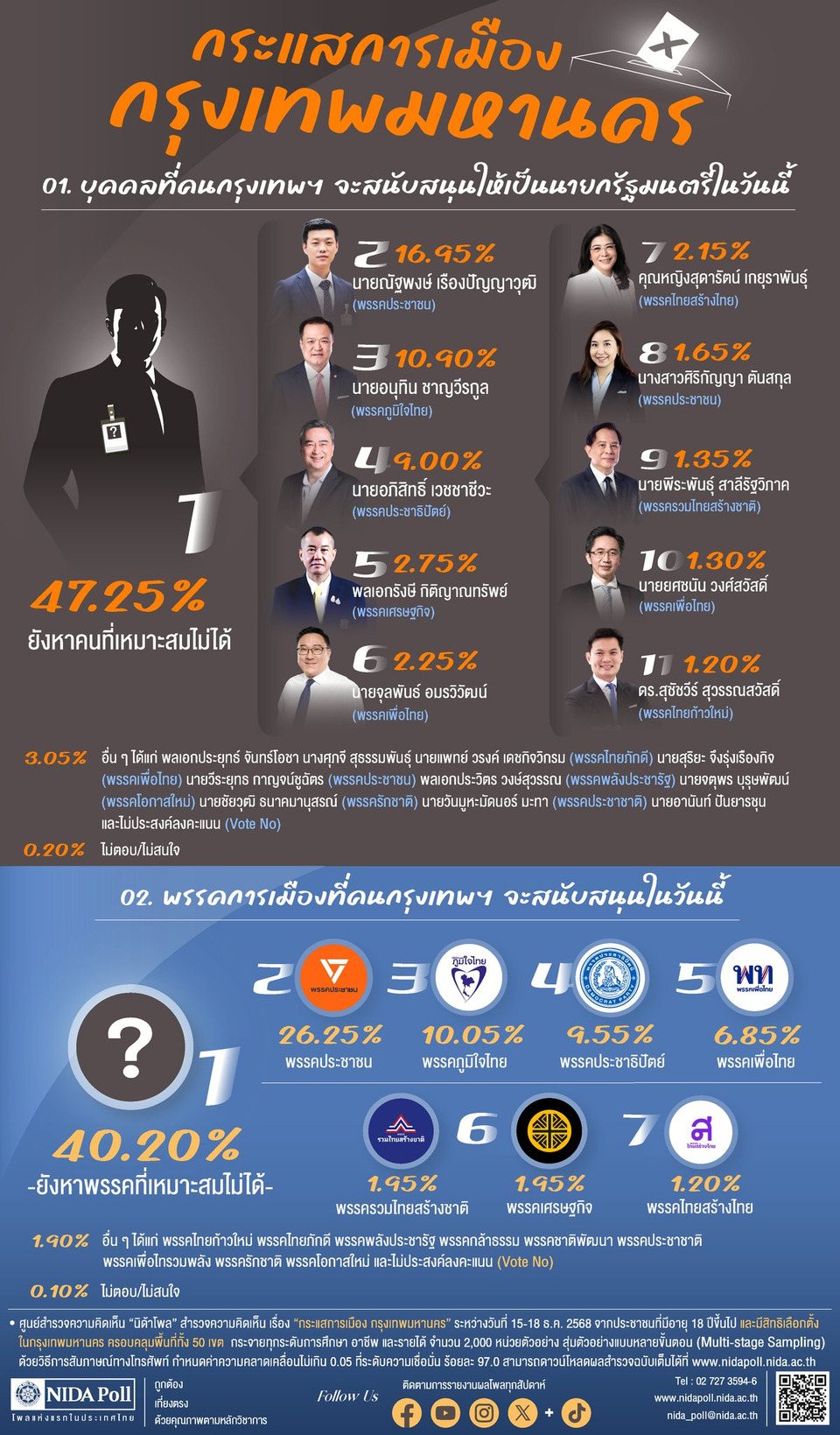 ในส่วนของ “พรรคการเมือง” ที่คนกรุง จะสนับสนุนในวันนี้ พบว่า อันดับ 1 ร้อยละ 40.20 ระบุว่า ยังหาพรรคการเมืองที่เหมาะสมไม่ได้ , อันดับ 2 ร้อยละ 26.25 ระบุว่าเป็น พรรคประชาชน