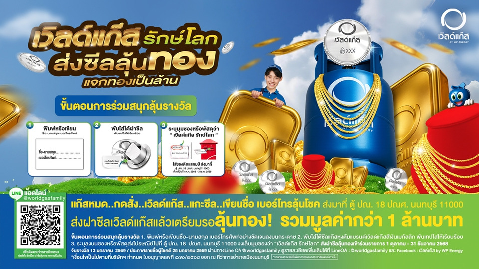วันที่ 7 ต.ค.68 บริษัท ดับบลิวพี เอ็นเนอร์ยี่ จำกัด (มหาชน) หรือ WP Energy บริษัทกลุ่มพลังงานครบวงจร ผู้นำการค้าก๊าซปิโตรเลียมเหลว (LPG) แบรนด์ “เวิลด์แก๊ส” เปิดตัวแคมเปญใหญ่ “เวิลด์แก๊ส รักษ์โลก ส่งซีลลุ้นทอง แจกทองเป็นล้าน” ชวนผู้บริโภคและคู่ค้ามาร่วมเป็นส่วนหนึ่งของกิจกรรมรักษ์โลกและช่วยเหลือสังคมพร้อมลุ้นรับรางวัลทองคำ รวม 30 รางวัล มูลค่ารวมกว่า 1.4 ล้านบาท โดยซีลพลาสติกเวิลด์แก๊สที่ถูกส่งผ่านตู้ ปณ. หรือถูกหย่อนลงในกล่องรับชิ้นส่วน ณ จุดให้บริการที่ร่วมรายการ ภายหลังจบจากแคมเปญแล้ว จะถูกนำเข้าสู่กระบวนการรีไซเคิลที่ถูกวิธี หรือนำไปบริจาคให้องค์กร ชุมชน เพื่อนำไปผลิตของใช้จำเป็นให้กับผู้ที่ขาดแคลน สะท้อนความมุ่งมั่นในการขับเคลื่อนธุรกิจควบคู่ไปกับการสร้างสรรค์คุณค่าเพื่อสังคมและสิ่งแวดล้อมอย่างยั่งยืน