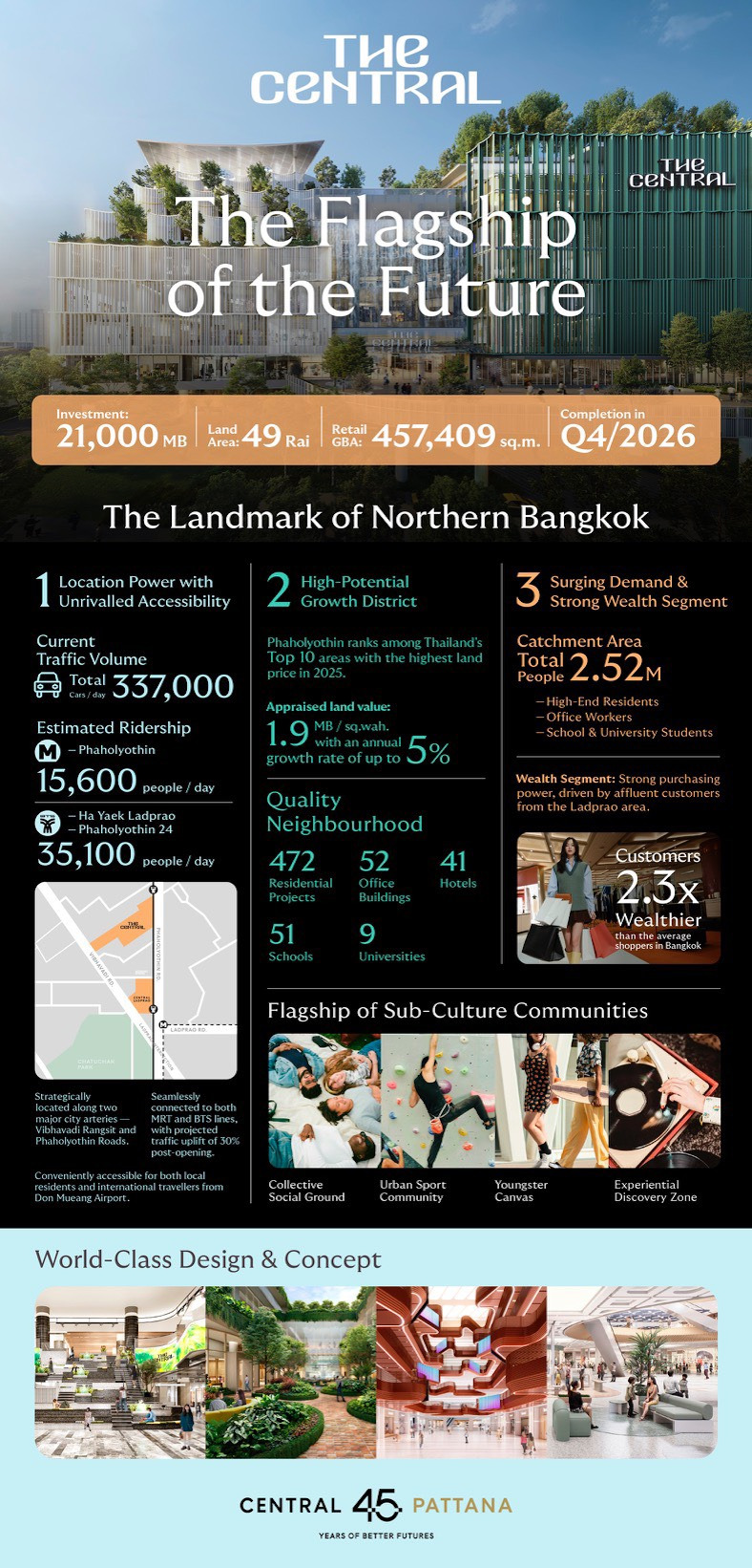 • พหลโยธินมีศักยภาพเทียบชั้นย่านราชประสงค์: ในฐานะย่านที่เป็นทำเลยุทธศาสตร์เหมาะกับการพัฒนาโครงการระดับ World-Class ได้แก่ 1) Transit-Oriented Development: เติบโตบนฐานโครงสร้างคมนาคมหลัก ทั้ง BTS, MRT และถนนสายสำคัญ เป็นจุดเชื่อมต่อการใช้ชีวิต–การทำงาน–การเดินทาง, 2) High-Density & Mixed Demand: รายล้อมด้วยดีมานด์คุณภาพสูง ทั้งที่อยู่อาศัยระดับกลาง–บน อาคารสำนักงาน โรงแรม และสถาบันการศึกษา และ 3) Anchor of Flagship Brands: เช่นเดียวกับที่ centralwOrld เป็น ‘Flagship Landmark’ ของราชประสงค์ ดังนั้น The Central พหลโยธิน จะเป็น ‘The Landmark of Northern Bangkok’ ที่ขับเคลื่อนการเติบโตของย่าน