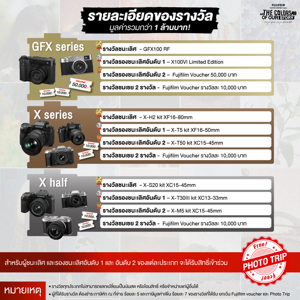 โดยผู้ส่งภาพเข้าประกวดจะได้ชิงรางวัลจาก Fujifilm Photo Contest 2025 มูลค่ารวมกว่า 1,000,000 บาท ประกอบด้วย