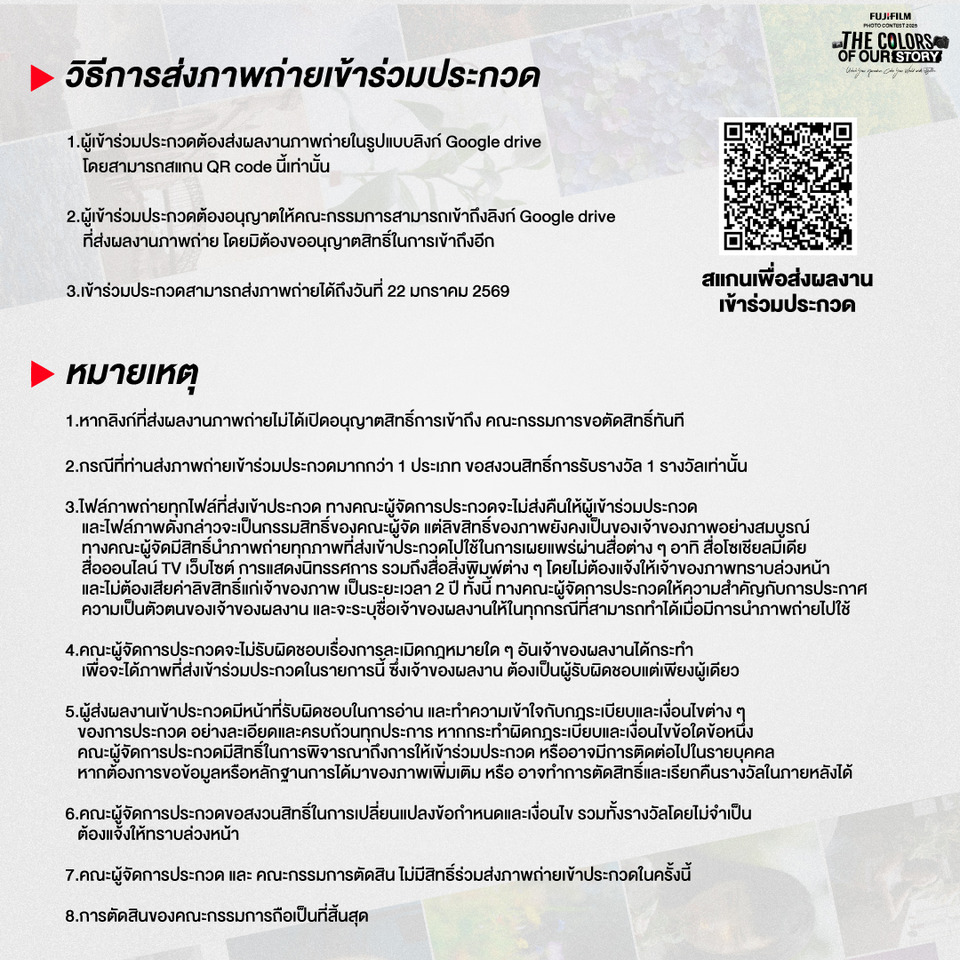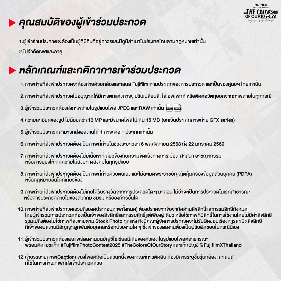 อย่าปล่อยให้โอกาสนี้หลุดมือ Fujifilm Photo Contest 2025 เปิดรับสมัครและส่งผลงานได้ตั้งแต่วันนี้ - 22 มกราคม 2569 และประกาศรายชื่อผู้ชนะในวันที่ 19 กุมภาพันธ์ 2569 ผ่านทางเพจ Facebook “Fujifilm X Thailand” ผู้ที่สนใจสามารถอ่านรายละเอียดการสมัคร กติกา และเงื่อนไขการประกวดเพิ่มเติมได้ที่ https://fujifilm-xspace.com/pages/fujifilm-photo-contest แล้วมาร่วมเป็นส่วนหนึ่งของสีสันที่โลกต้องจดจำ